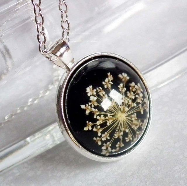Oryginalny i zarazem bardzo elegancki, ręcznie wykonany naszyjnik z prawdziwymi suszonymi kwiatami zatopionymi w żywicy, w oprawie w kolorze srebra. Główne atuty tego naszyjnika to niezwykłej urody wypukle oczka z kwiatami, z efektem głębi i uniwersalna, nowoczesna forma i kolorystyka. Biżuteria hipoalergiczna, bez niklu i ołowiu.