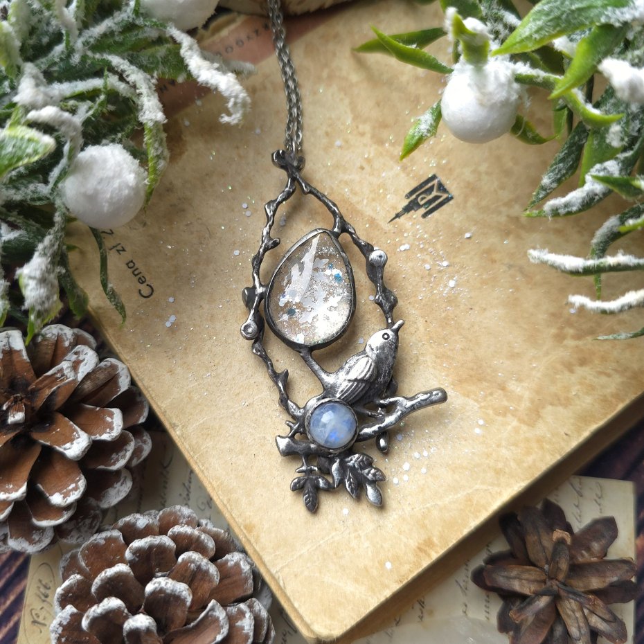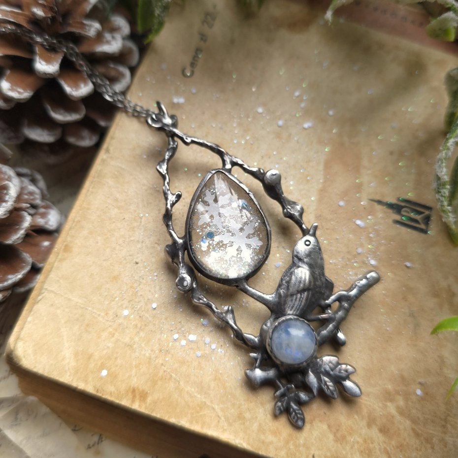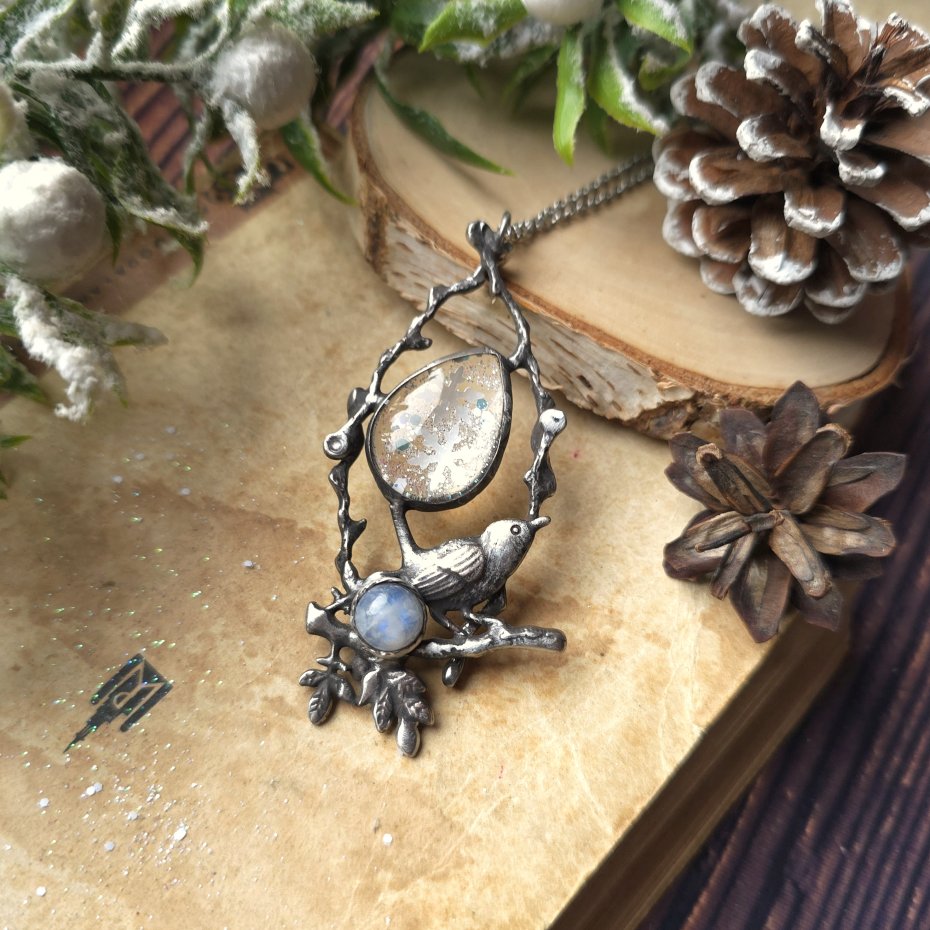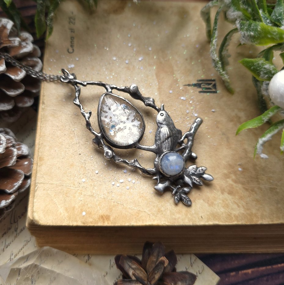 Ozdobę wisiora stanowi sikorka przysiadająca na gałęzi drzewa oraz kamień ksieżycowy.