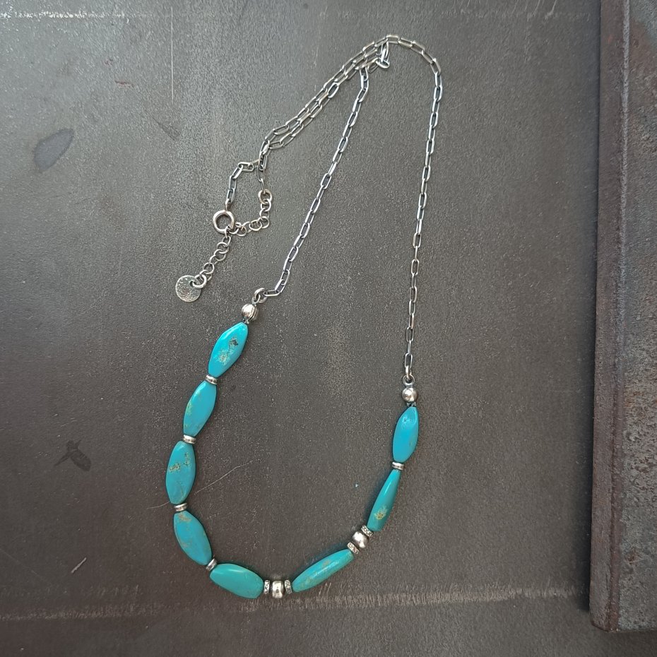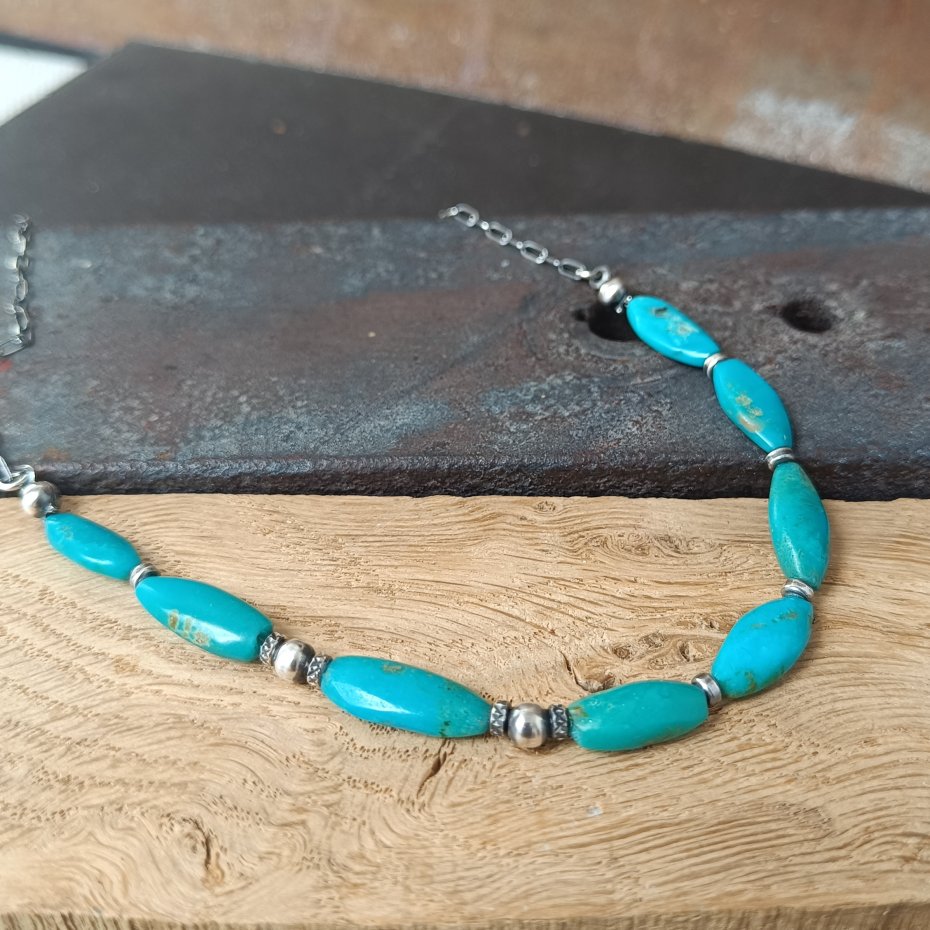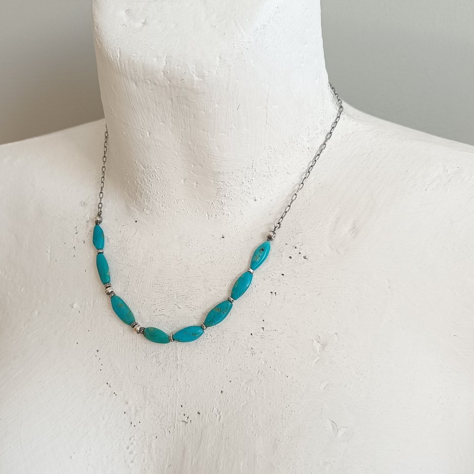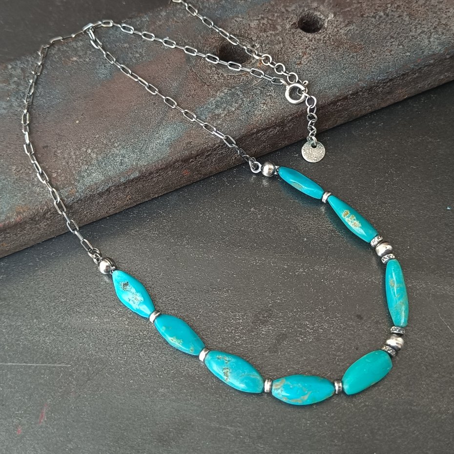 Naszyjnik został wykonany z naturalnych turkusów z Arizony, uzupełniony oksydowanym i polerowanym srebrem próby 925.
