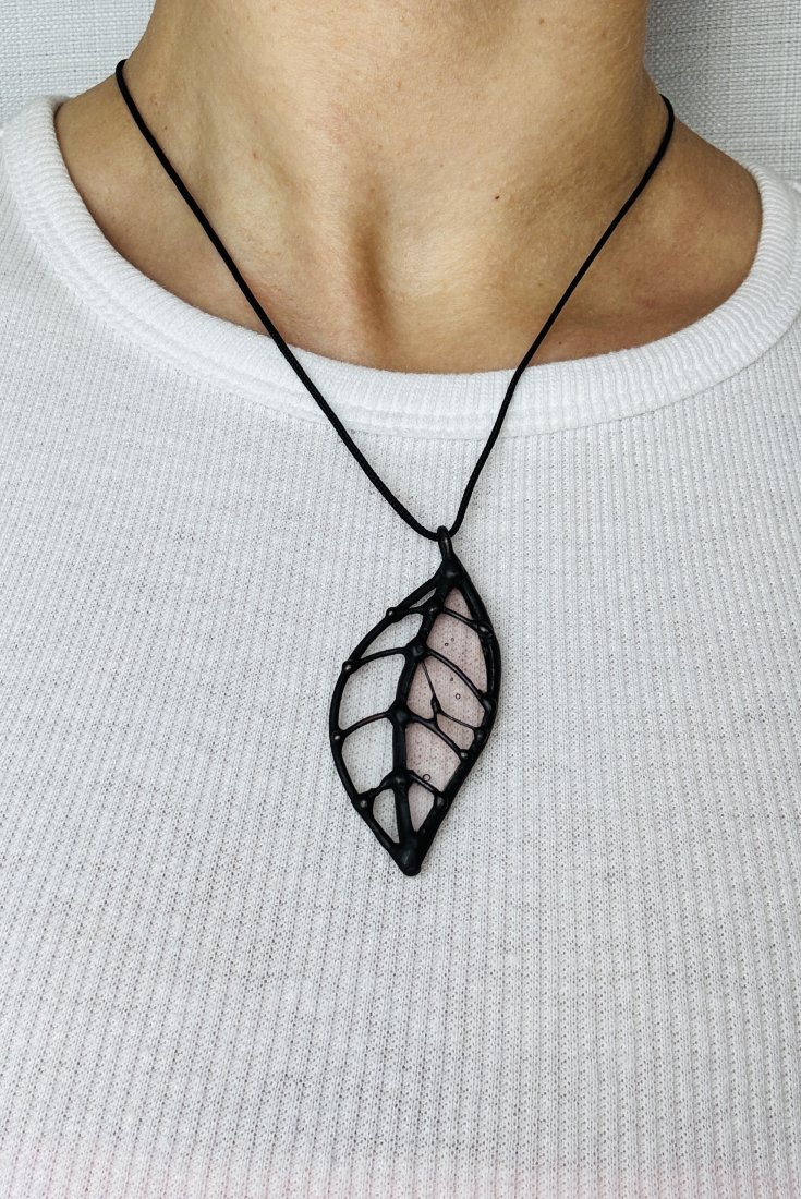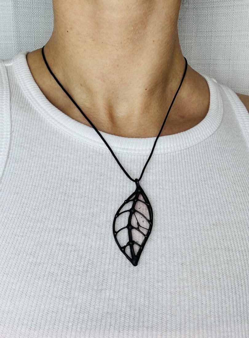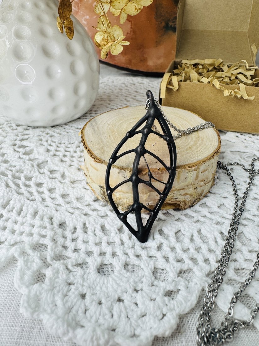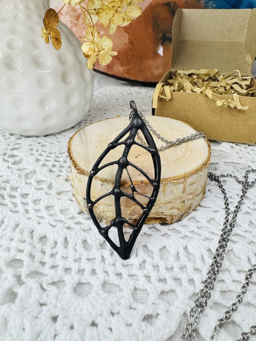 Wisiorek dostępny jest z białym lub czarnym sznurkiem do wyboru. Rozmiar listka 5 cm/3,5 cm.