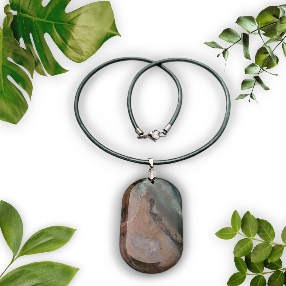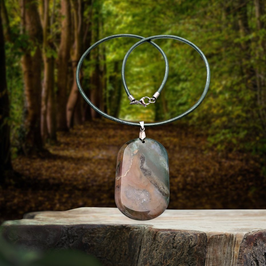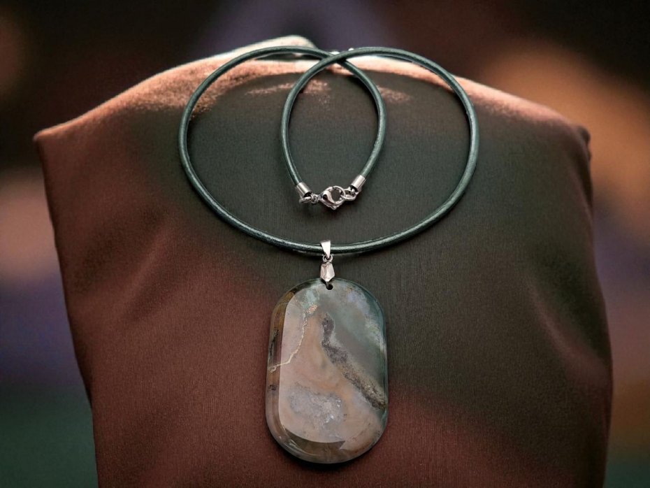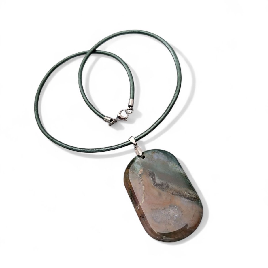 Naszyjnik z wisiorkiem z agatu mszystego, zawieszonym na skórzanym rzemieniu w kolorze khaki z połyskiem. Wymiary zawieszki z agatu ok. 5,7cm x 3,7cm.