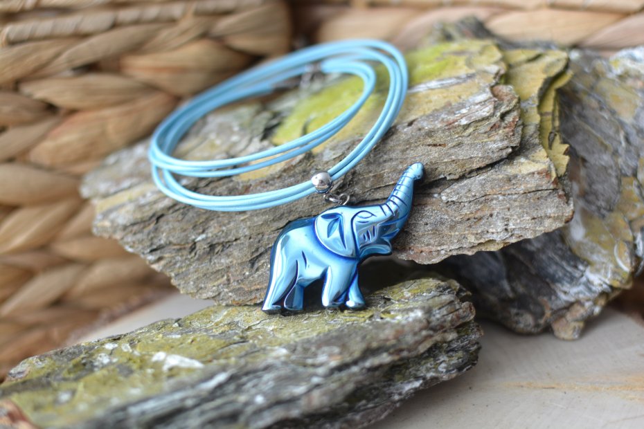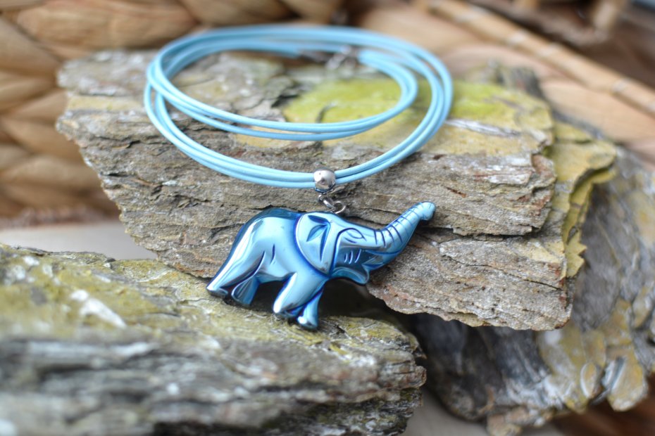 Naszyjnik z wisiorkiem w kształcie słonia z platerowanego hematytu w kolorze niebieskim, zawieszonym na skórzanych rzemieniach w kolorze jasnoniebieskim. Wymiary zawieszki ok. 4cmx3,5cm.
