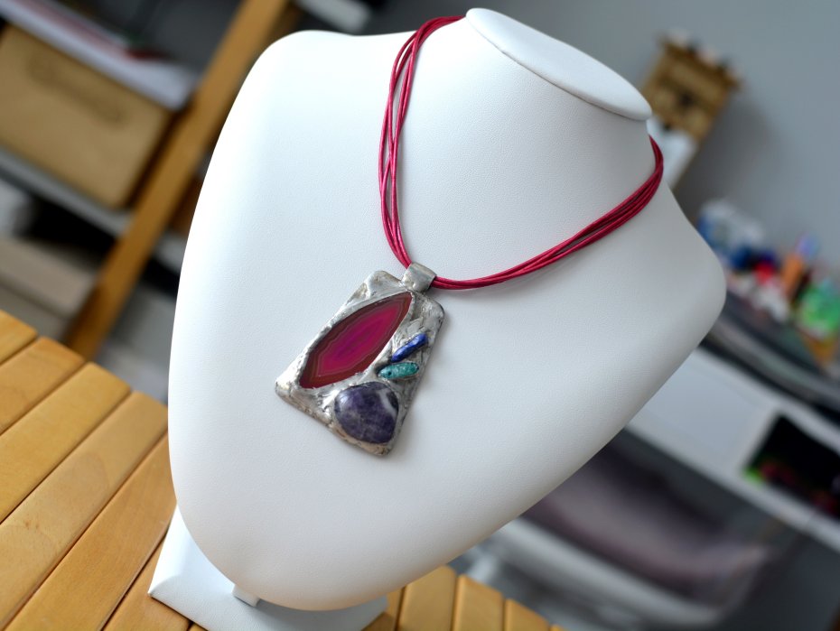 materiał: plaster agatu, bryłki ametystu, amazonitu, lapisu, blacha z mosiądzu, taśma miedziana, cyna;