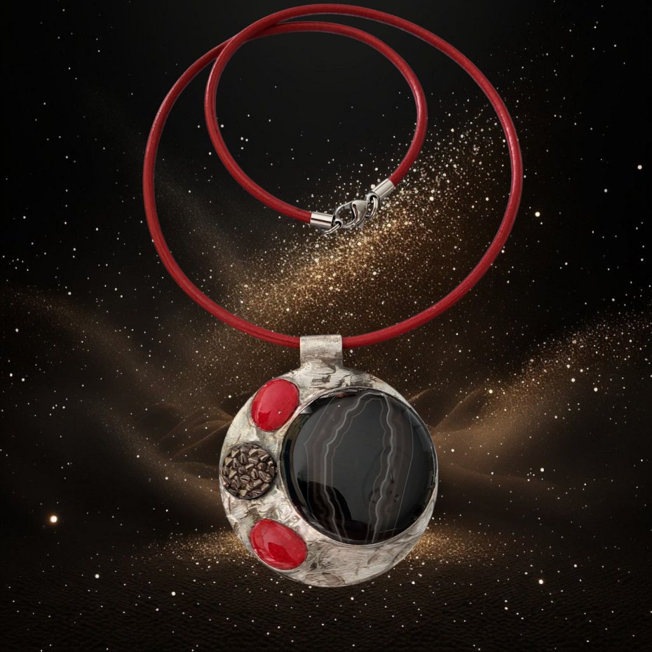 Wisior został zawieszony na skórzanym rzemieniu o długości z zapięciem ok. 52cm (+ 5 cm łańcuszka regulacyjnego).