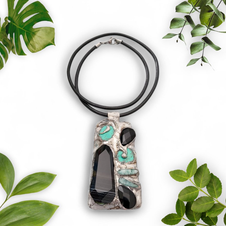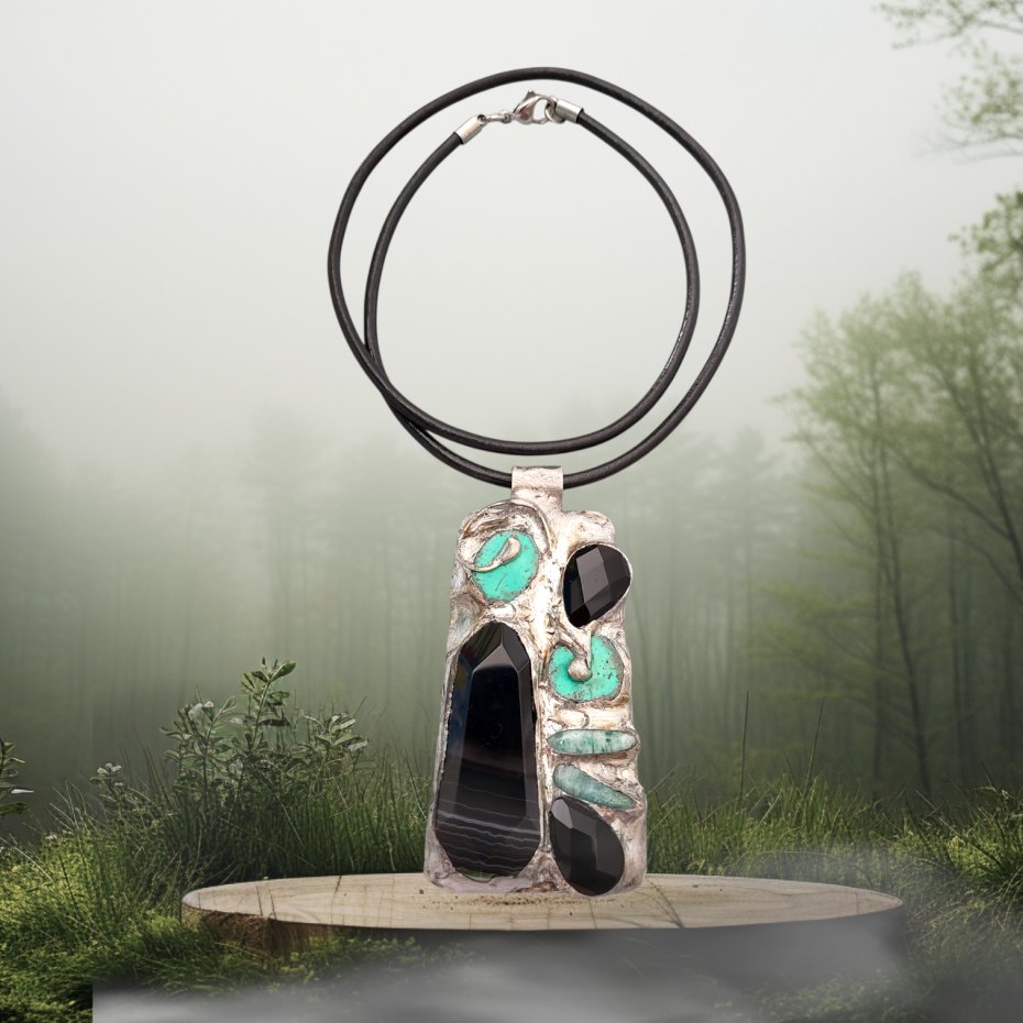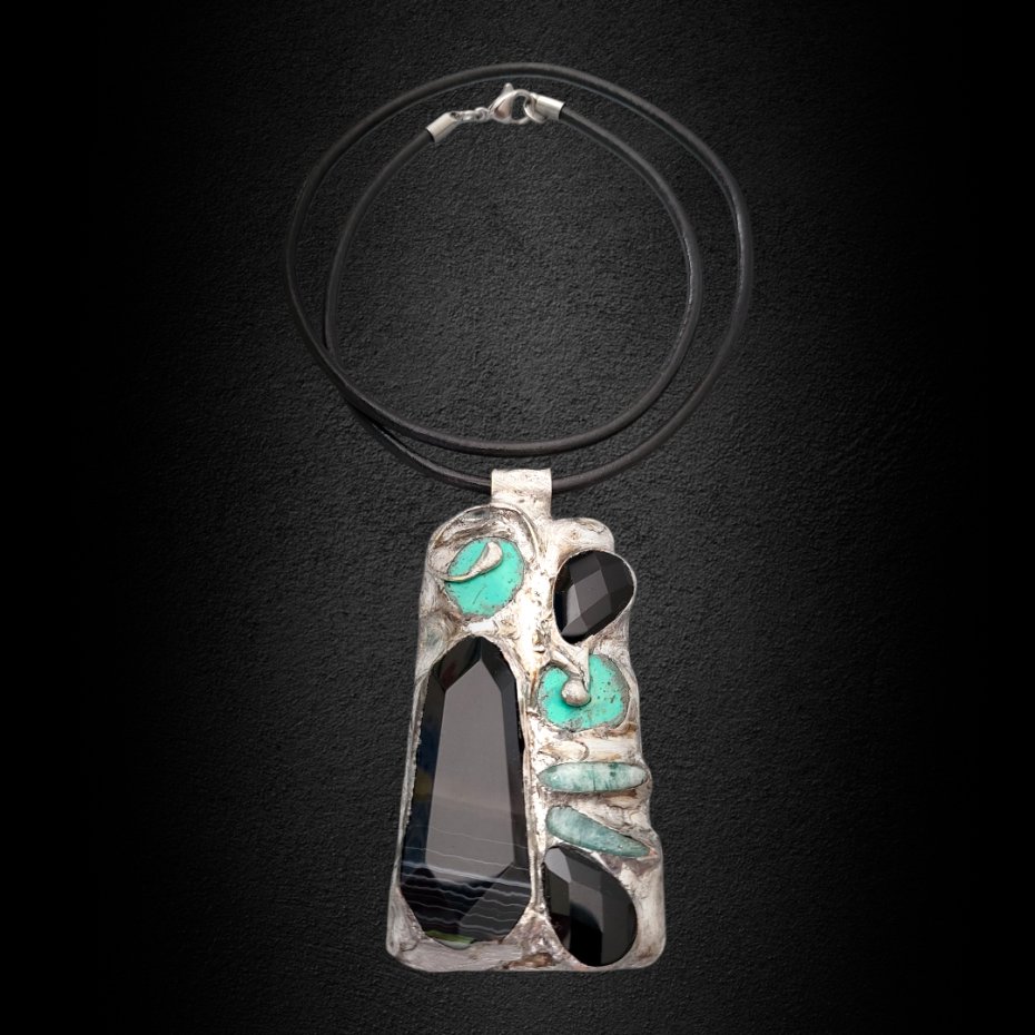 materiał: gruby plaster fasetowanego agatu, łezki onyksu i pastylki howlitu, sople amazonitu, blacha z mosiądzu, taśma miedziana, cyna;
