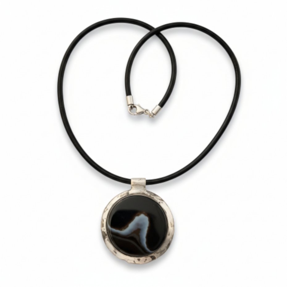 Rzemień został wykończony elementami ze stali szlachetnej. Naszyjnik zapinany jest na karabińczyk.