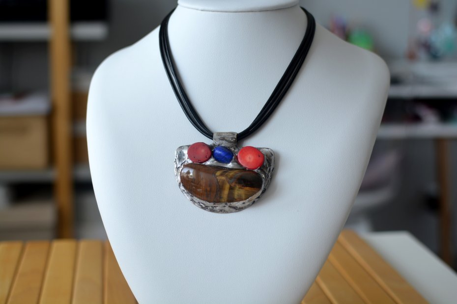 materiał: bryłka tygrysiego oka, plastry korala, jadeit, blacha z mosiądzu, taśma miedziana, cyna;