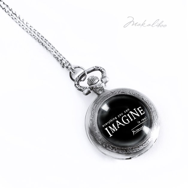 Romantyczny, kobiecy naszyjnik - zegarek. Autorska grafika z sentencją Pablo Picasso Everything you can imagine is real.ukryta pod dużym 25 mm szkiełkiem , Wielkość zegarka 38 mm. Tarcza sygnowana logotypem. Długość łańcuszka 80 cm. Zegarek posiada mechanizm kwarcowy i wymienną baterię. Projekt autorski. Wszystkie prawa zastrzeżone.