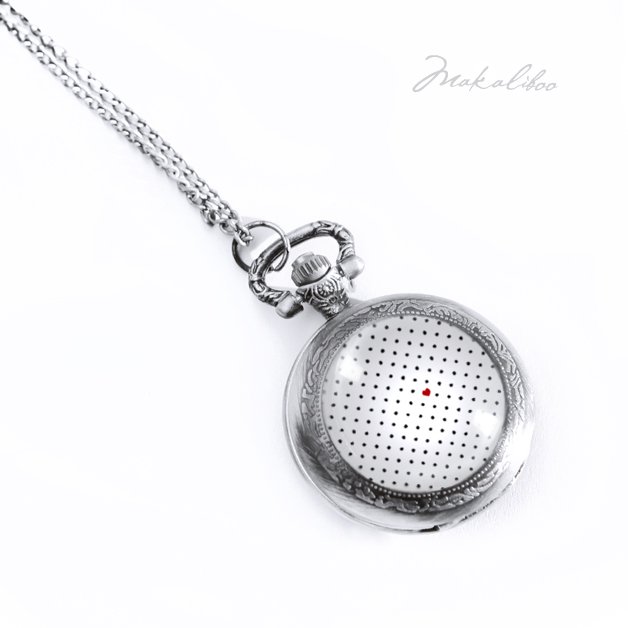 Romantyczny, kobiecy naszyjnik - zegarek. Autorska grafika ukryta pod dużym 25 mm szkiełkiem , Wielkość zegarka 38 mm. Tarcza sygnowana logotypem.