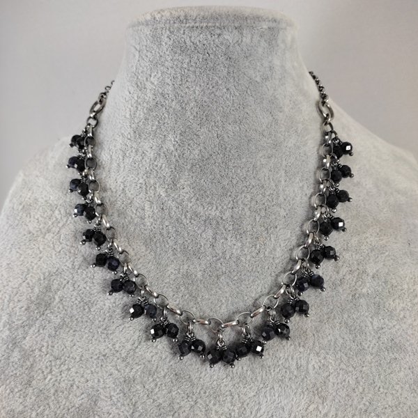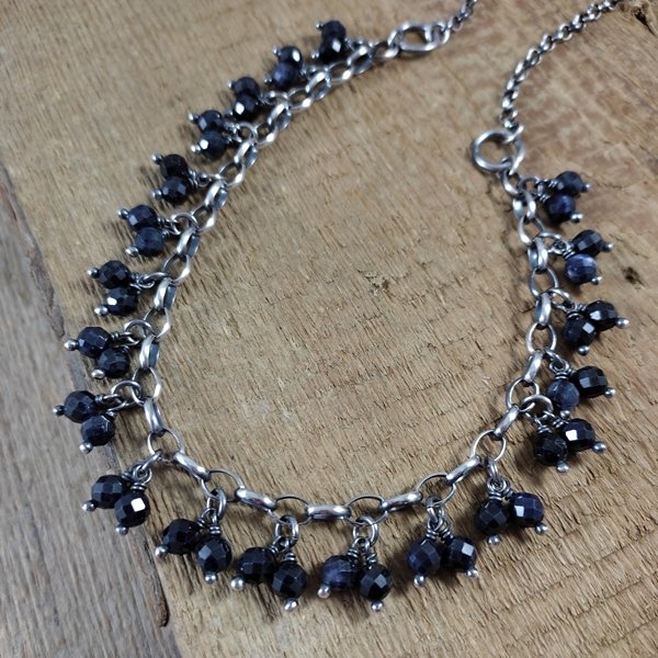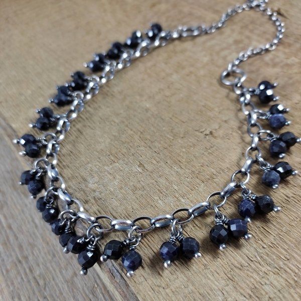 Naszyjnik wykonany z fasetowanych kul szafiru 5.5 mm. Całość wykończona w srebrze 925, oksydowanym i wypolerowanym. Długość naszyjnika wynosi ok. 40/45/50 cm, plus łańcuszek regulacyjny 5 cm. (Proszę wpisać w komentarzu, w przypadku braku wysyłamy 45 cm).