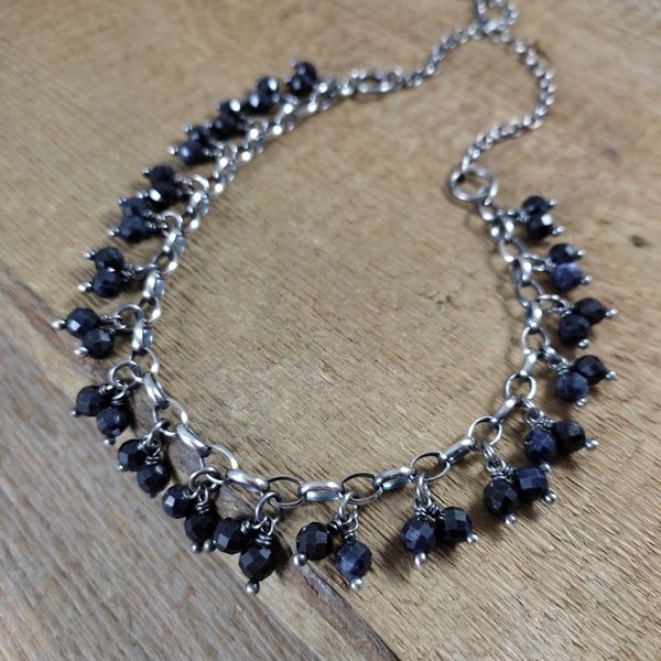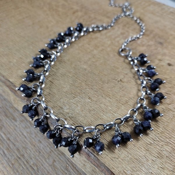 Naszyjnik wykonany z fasetowanych kul szafiru 5.5 mm. Całość wykończona w srebrze 925, oksydowanym i wypolerowanym. Długość naszyjnika wynosi ok. 40/45/50 cm, plus łańcuszek regulacyjny 5 cm. (Proszę wpisać w komentarzu, w przypadku braku wysyłamy 45 cm).