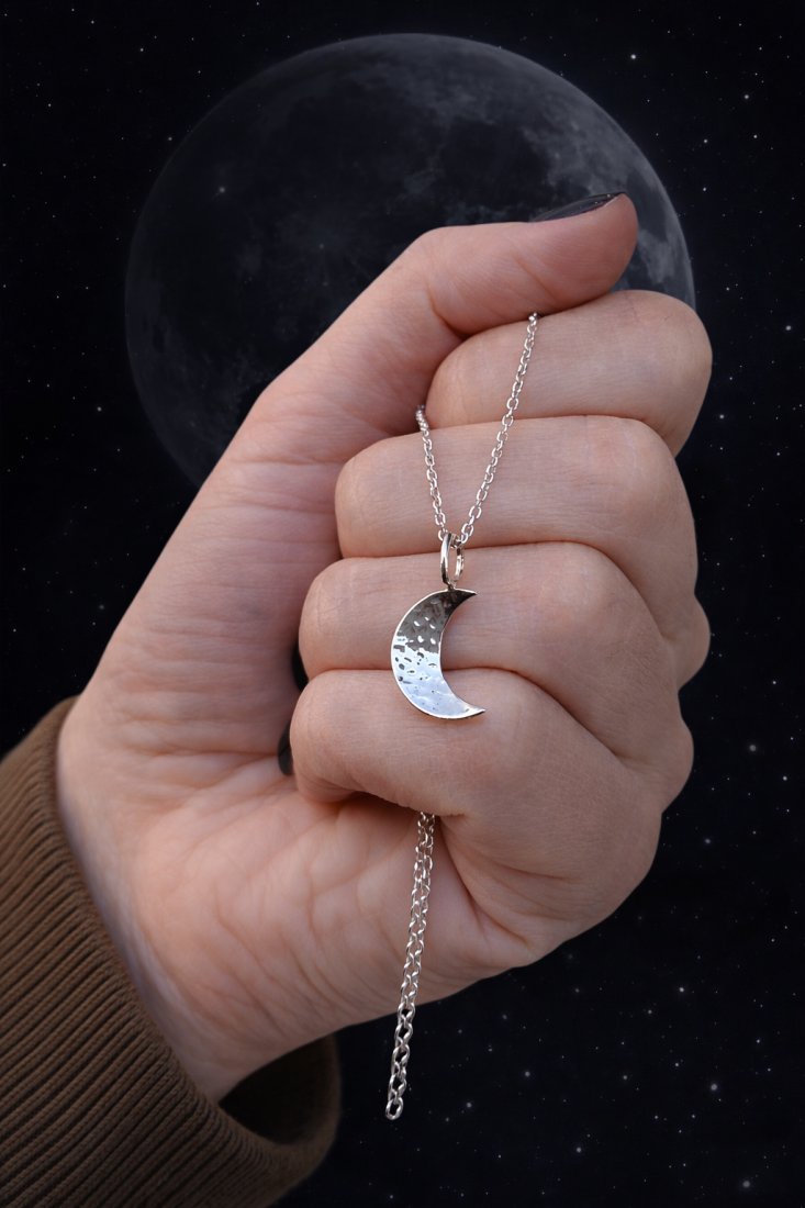 ✦Zdjęcie przedstawia produkt na tle nocnego nieba z cieniem Księżyca w nowiu — idealnie oddaje klimat i charakter zawieszki.