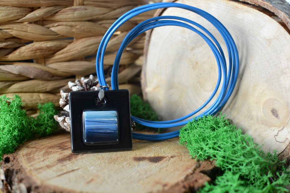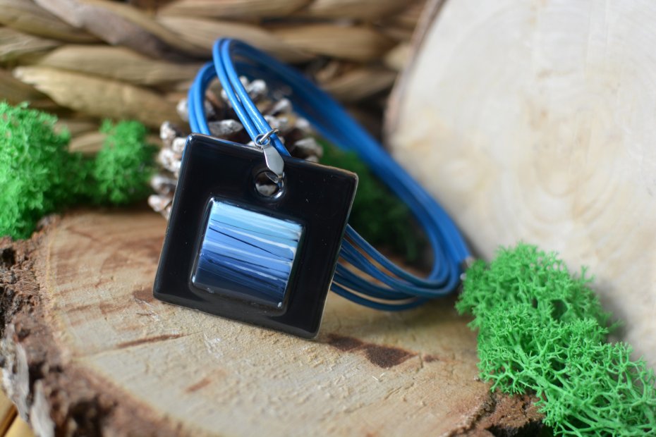 Naszyjnik z naturalnych, okrągłych rzemieni skórzanych lakierowanych z zawieszką ze szkła o wymiarach 38mmx38mm. Szkło ozdobiono ręcznie wykonanymi malunkami. Wszystkie elementy metalowe użyte w naszyjniku są ze stali szlachetnej.
