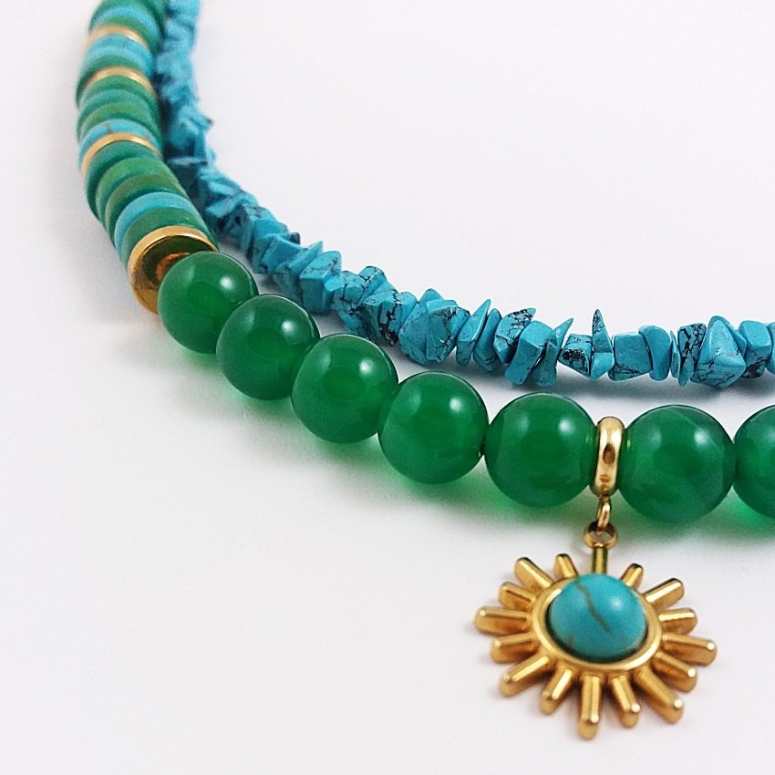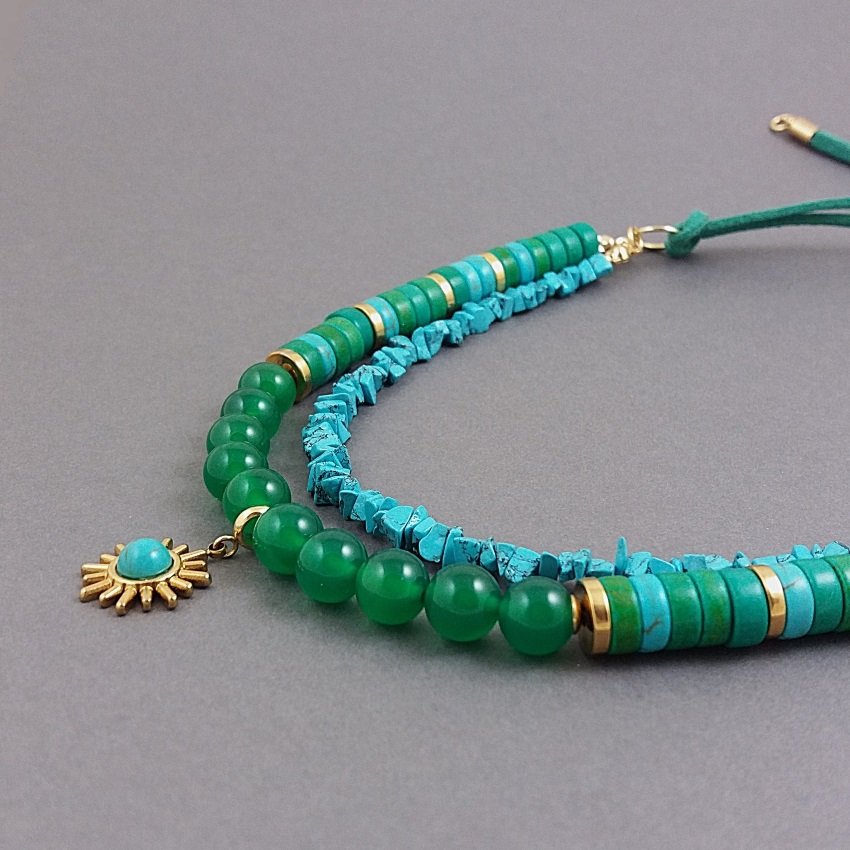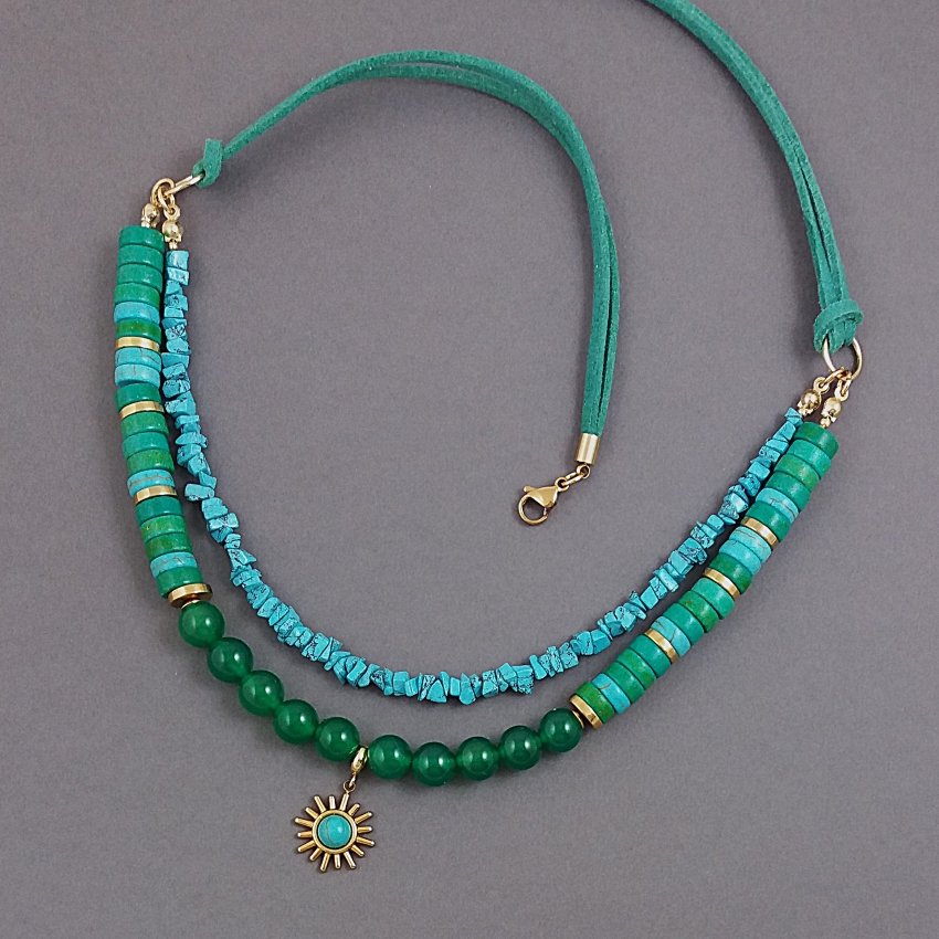 Podwójny, naszyjnik w stylu boho z naturalnych kamieni. Na zamszowym rzemieniu zawieszone są dwa sznury: jeden to tzw. sieczka z turkusowego, rekonstruowanego howlitu, drugi to krążki howlitu, zielonego i turkusowego, krążki z pozłacanej stali szlachetnej i gładkie kulki pięknego, zielonego onyksu. Kamienie mają średnicę 8mm, a urocza zawieszka 15mm.