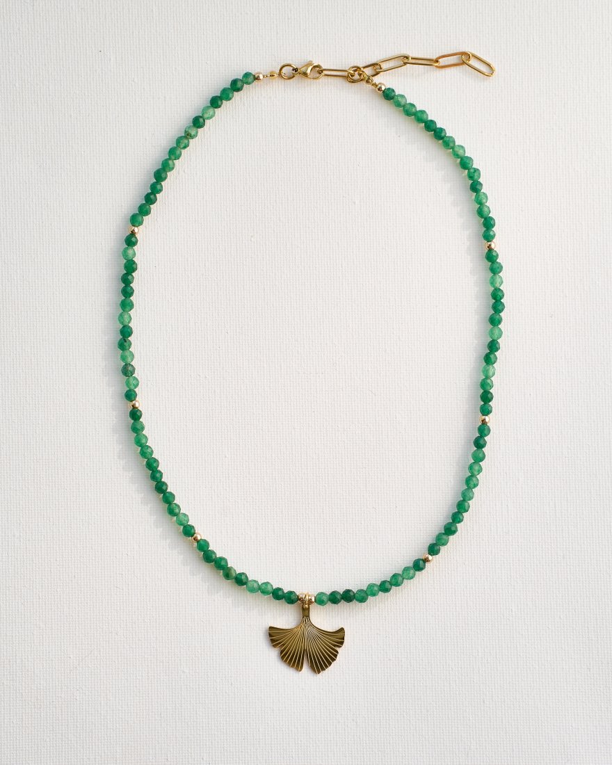 Subtelny naszyjnik z fasetowanych zielonych agatów z zawieszką z liściem miłorzębu. Zieleń kamieni rozdzielona jest małymi akcentami ze stali szlachetnej w kolorze złota, nawiązując do promieni słońca przebijających się przez gęste korony drzew.