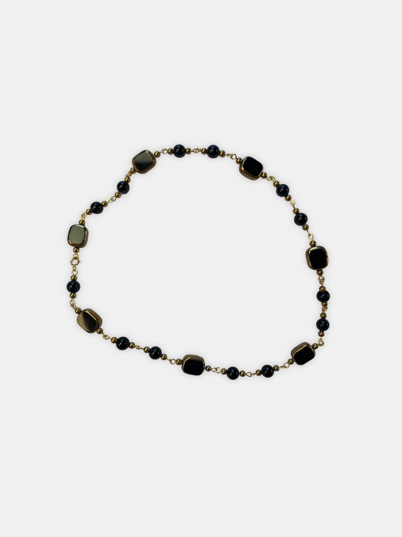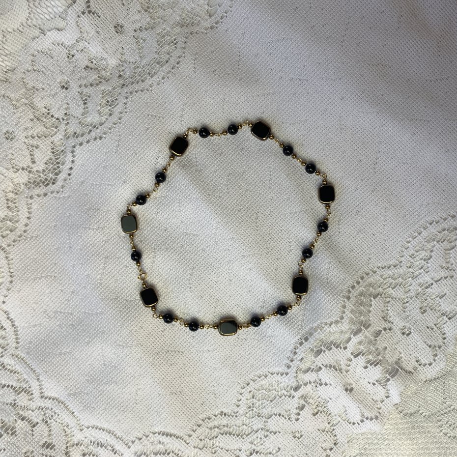 Ten naszyjnik typu choker emanuje wiktoriańską estetyką gotycką dzięki efektownym kwadratowym kamieniom z czarnego onyksu.