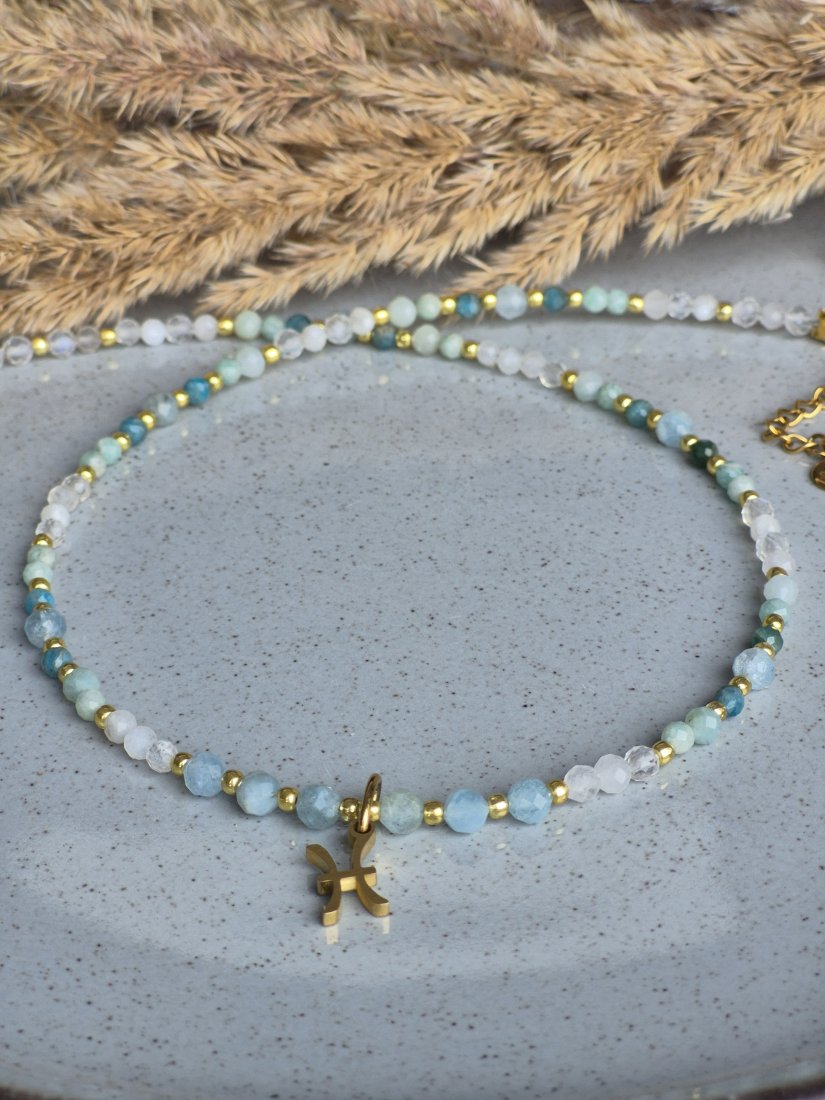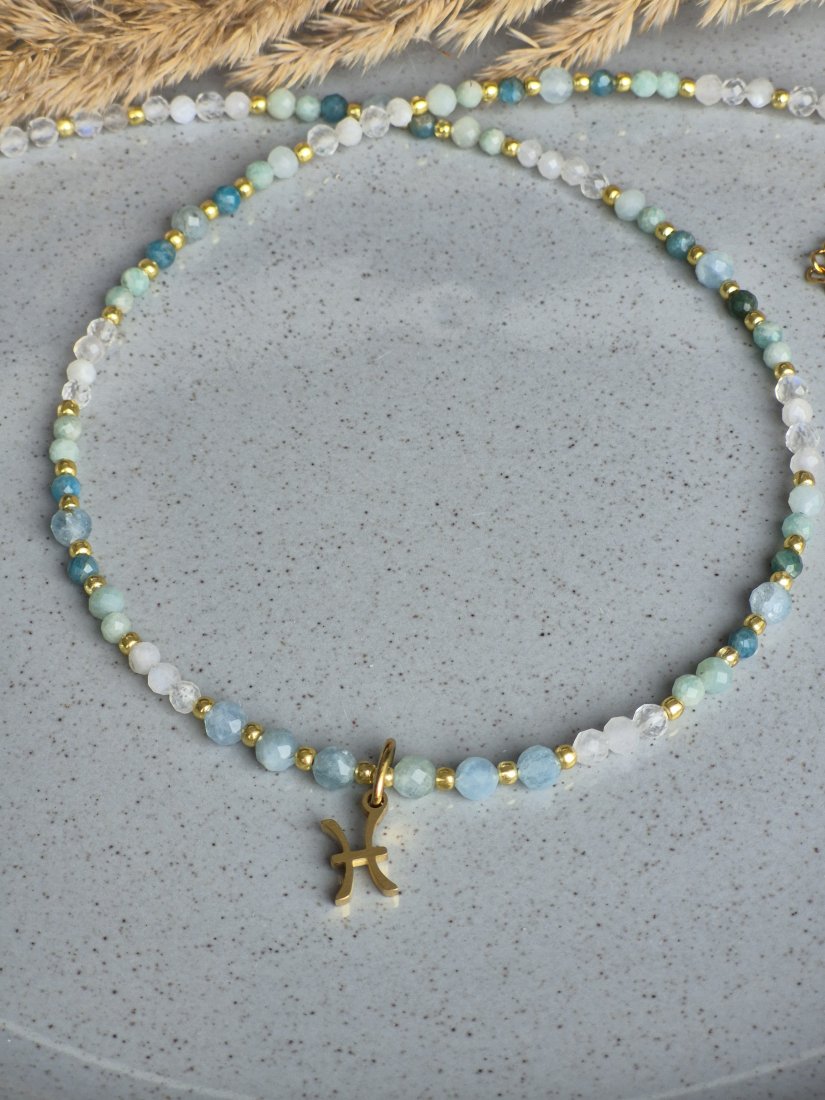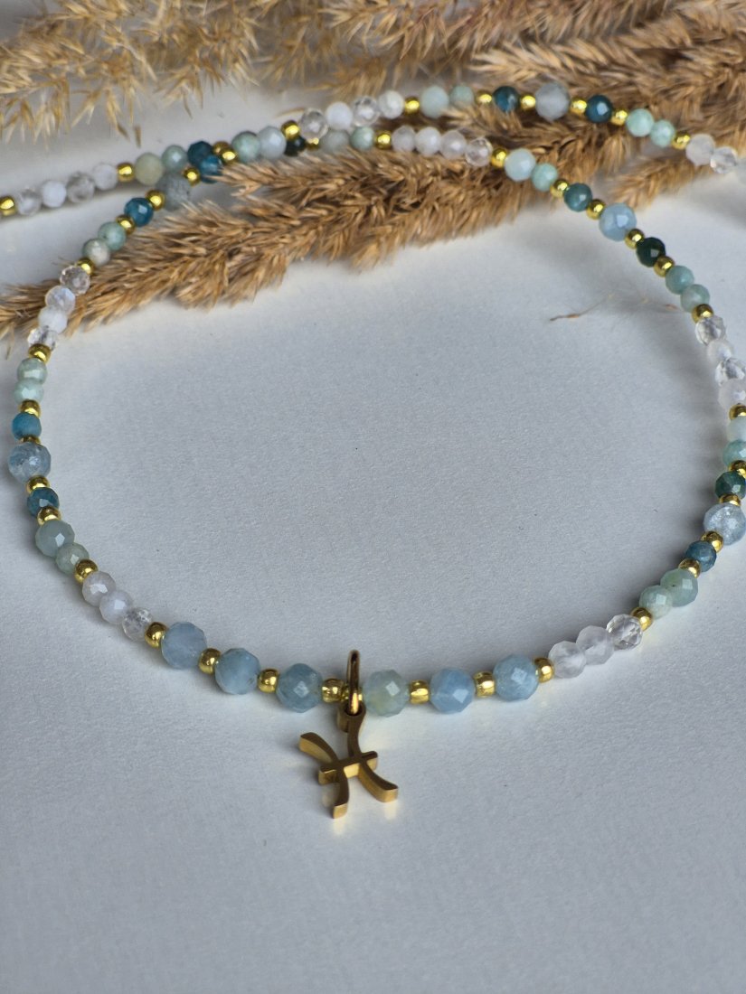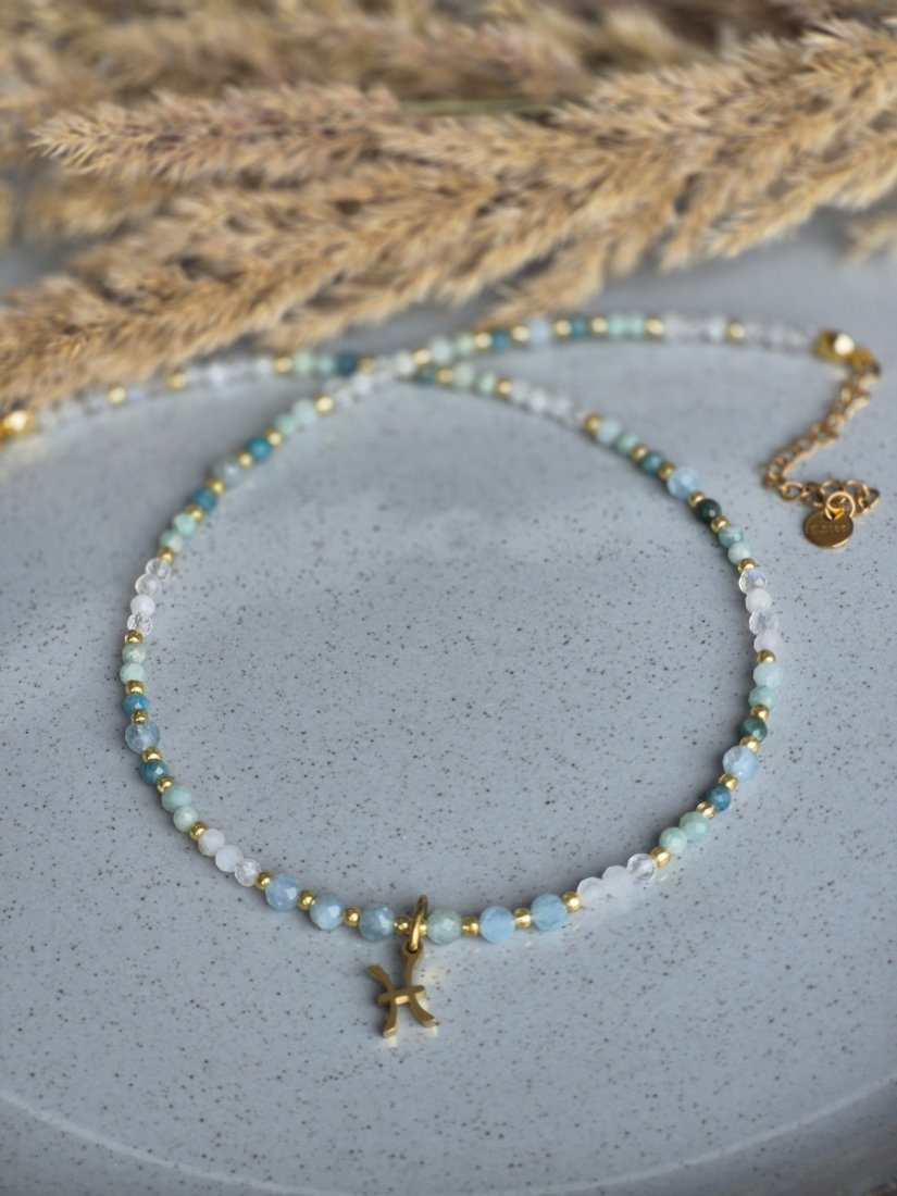 Poczuj głębię oceanu i magię intuicji z tym wyjątkowym naszyjnikiem typu choker, zaprojektowanym z myślą o zodiakalnych Rybach. Biżuteria łączy w sobie kamienie o subtelnych, wodnych barwach, które idealnie rezonują z wrażliwą i artystyczną duszą Ryb.
