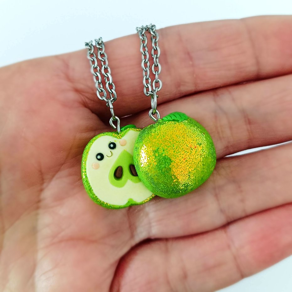 Każdy naszyjnik przedstawia jedną połówkę jabłka – razem tworzą całość, co czyni je pięknym symbolem przyjaźni, bliskości i miłości.