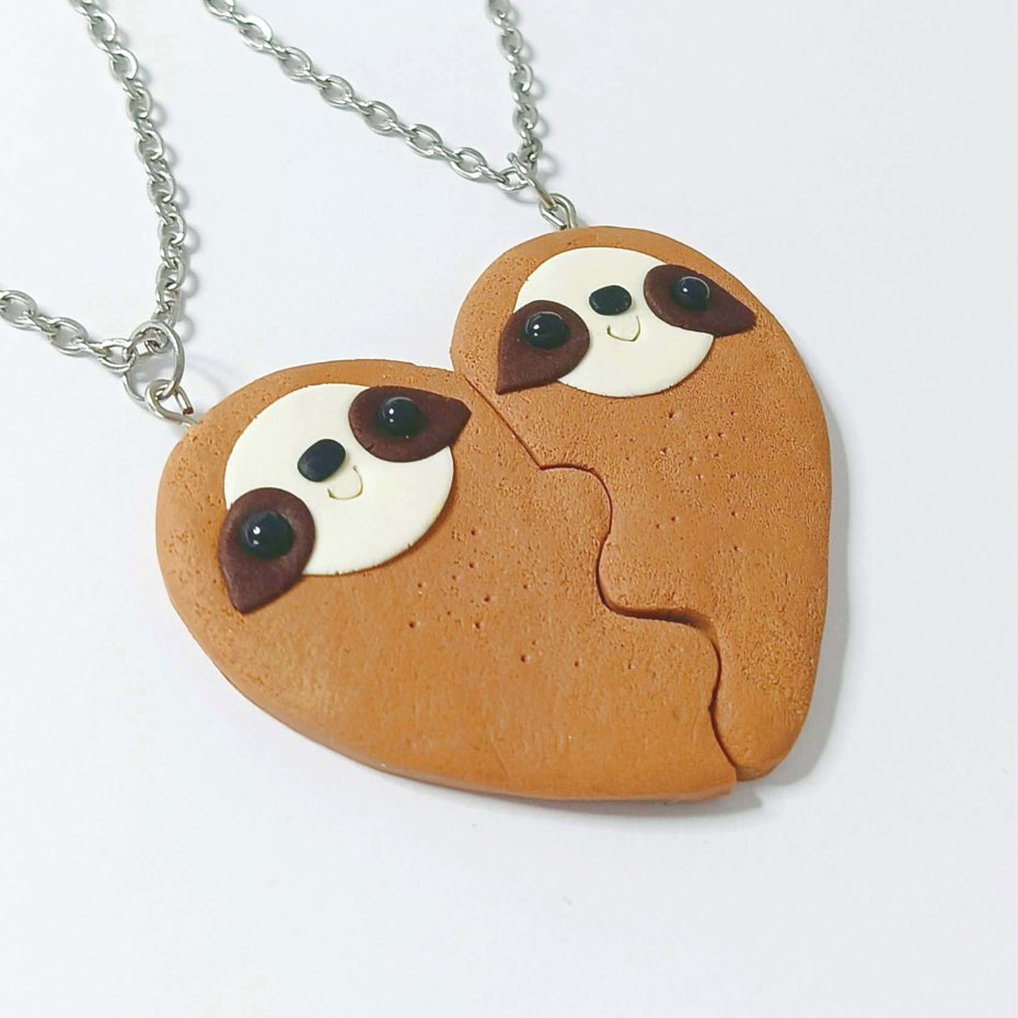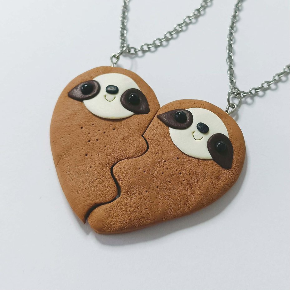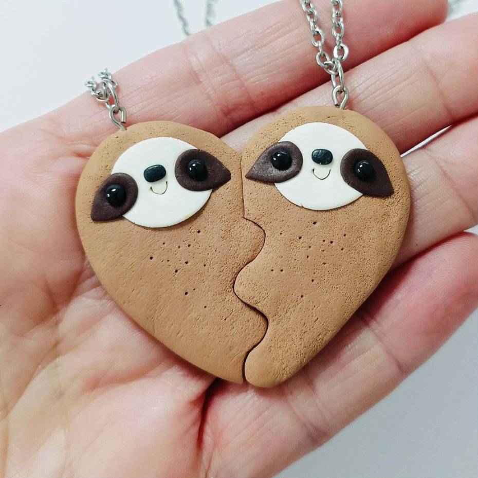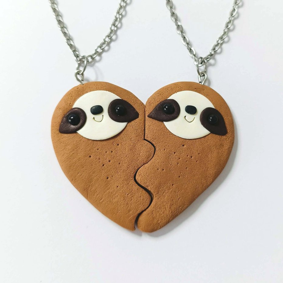 Uroczy zestaw dwóch pasujących naszyjników, przedstawiających dwie połówki jednego serca z leniwcami ????????