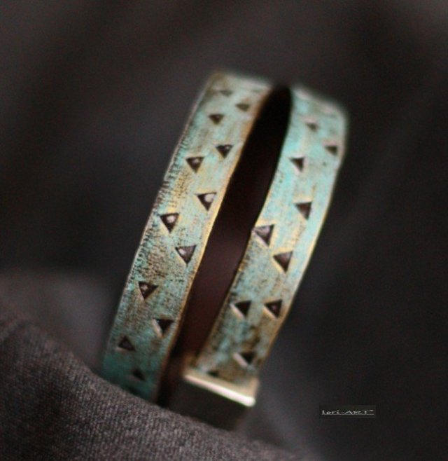 Intrygująca bransoletka wykonana z naturalnego miękkiego rzemienia (szer.10mm) z unikalną , wybijaną przeze mnie fakturą , następnie malowana nierównomiernie profesjonalnym , specjalistycznym metalicznym woskiem w tonacji aquamarine-gold . Oraz elementów z metalu antyalergicznego (wolne od ołowiu i niklu) w kolorze srebra . Zapinana na wygodne , mocne zapięcie . Bransoletka zabezpieczona odpowiednim medium przed wpływem czynników zewnętrznych . Biżuterie wysyłam w ozdobnym bezpiecznym opakowaniu . Bransoletka pasuje na nadgarstek 16 cm -17 cm (można skrócić) .
