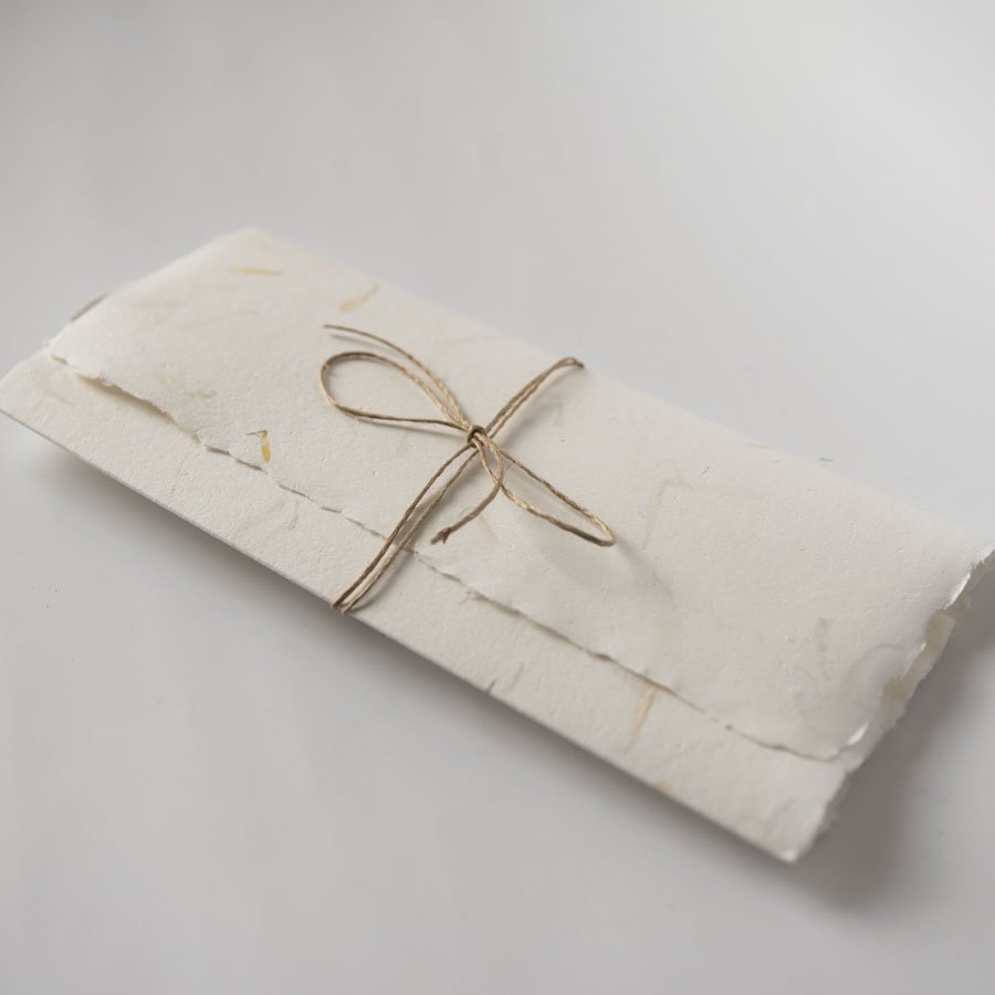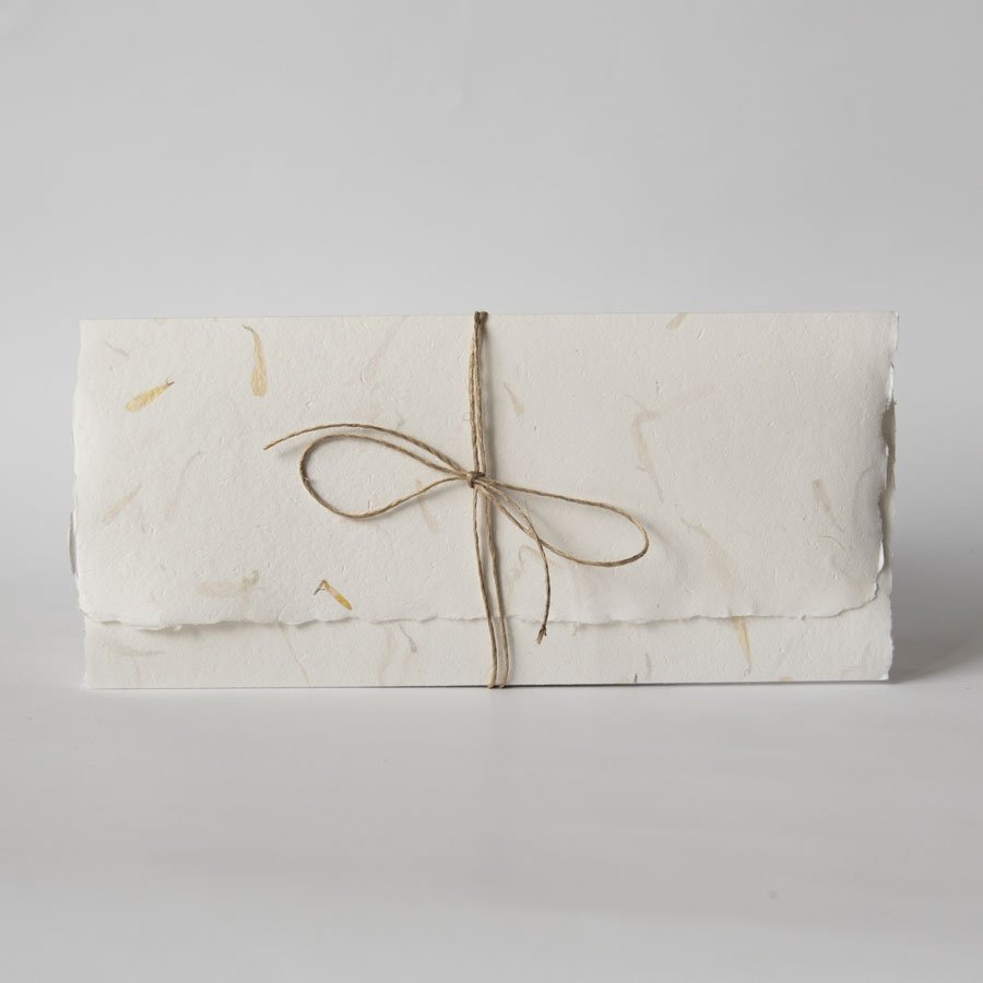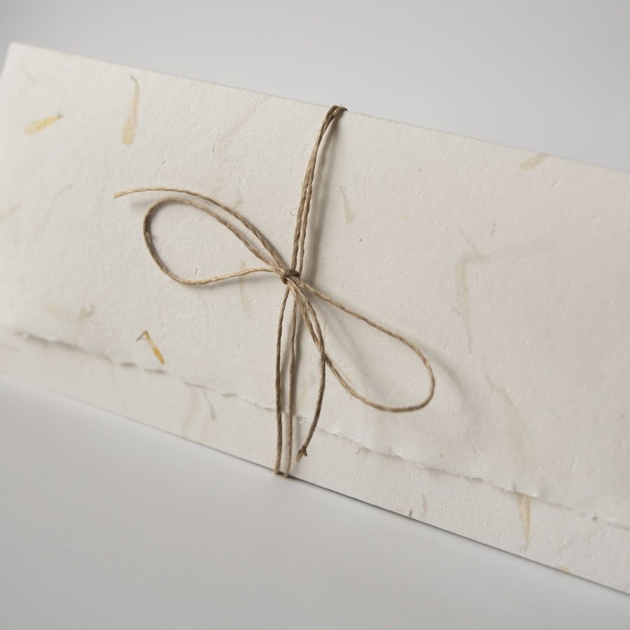 Minimalistyczna karta ślubna w formie składanego folderu. Powstała z przepięknego ręcznie czerpanego papieru z zatopionymi wewnątrz płatkami kwiatów. Przewiązana jest delikatnym cieniutkim sznureczkiem.