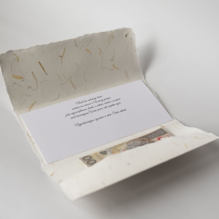 Kartka może się minimalnie różnić ze względu na reczne wykonanie (każdy arkusz papieru czerpanego jest też wyjątkowy i ma różne rozłożenie płatków na powierzchni).