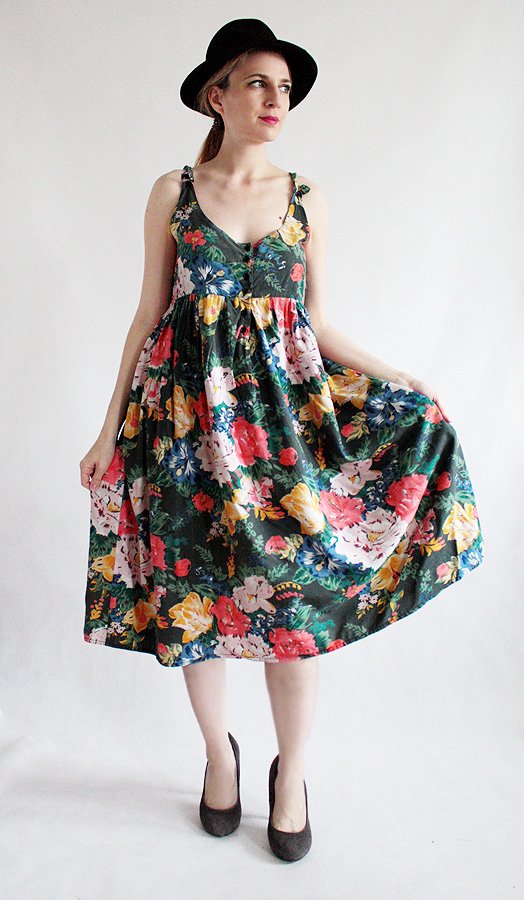 Kwiecista sukienka vintage z odpinanymi ramiączkami z przodu (możliwość regulacji długości na dwa guziczki). Na bokach gumka umożliwiająca dopasowanie do figury.