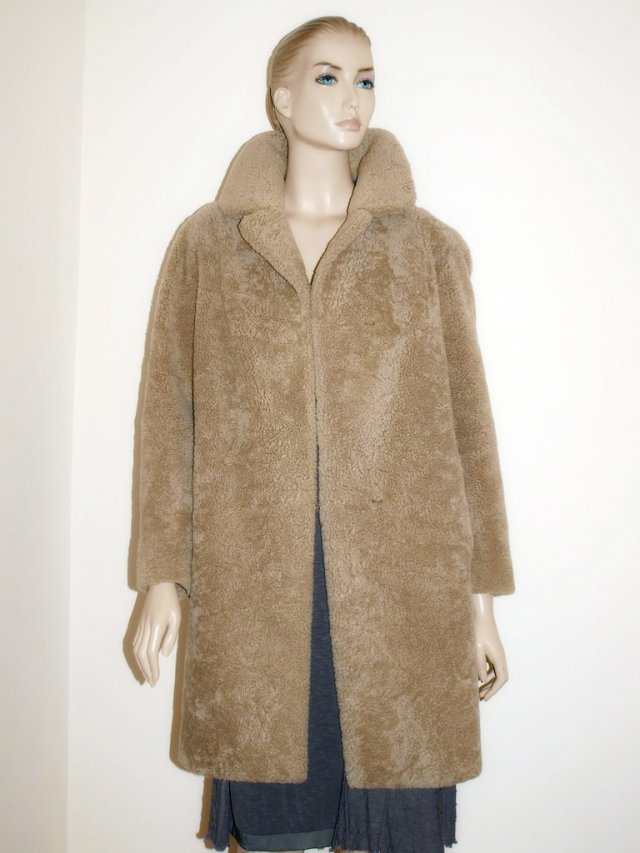 Piękne, futro vintage z naturalnej skóry, chyba strzyżony baran, w beżowym kolorze. prosty, pudełkowy fason, kieszenie do wewnątrz. Brak jakichkolwiek metek, sądzę, że było szyte w jakiejś pracowni, wg. starej szkoły kusnierskiej, sztywniejsze, trzymające fason i dosyć ciężkie. Prezentowane na manekinie o rozmiarze 38, chyba polecałabym dla 38-40 może także 42. skóra uważam jest w bardzo dobrym stanie, lekkie przytarcie od wewnętrznej strony rękawów niewidoczne na zewnatrz i pod jedną pachą (zdjęcia).
