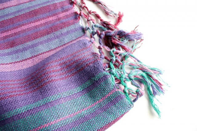Duży, miękki szal w pasy w głębokich odcieniach błękitu i fioletu. Sploty mają nierównomierną, naturalną strukturę. Materiał to prawdopodobnie bawełna lub wiskoza.
