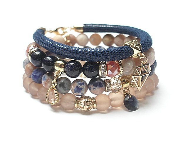 PROJEKT AUTORSKI. Własność Ki-Ka. KOPIOWANIE ZABRONIONE. Komplet czterech bransoletek wykonanych z naturalnych kamieni - matowy kamień słoneczny [8mm], jaspis [8mm], matowe szklane kuleczki [8mm], noc kairu [8mm], kryształki [8mm], efektownej zawieszki ze szkła w koronkowej oprawie platerowanej mosiądzem, rzemienia z naturalnej skórki cielęcej [śr. 5mm], zawieszki z kryształka Swarovskiego oraz elementów metalowych w kolorze złota. Pasują na nadgarstek 16 - 17cm . Biżuteria ozdobnie zapakowana.