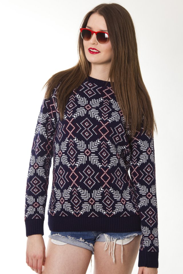 Ciepły wzorzysty sweter w kolorze ciemnogranatowym z białymi i bordowymi printami. Fajnie się w niego wtulić :)