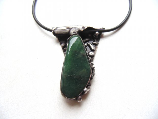 Wisiorek wykonany technika witrażową z miedzi, cyny i nefrytu. Zawieszony na czarnej lince kauczukowej o długości ok. 45 cm. Wymiary ok. 6 na 3 cm.