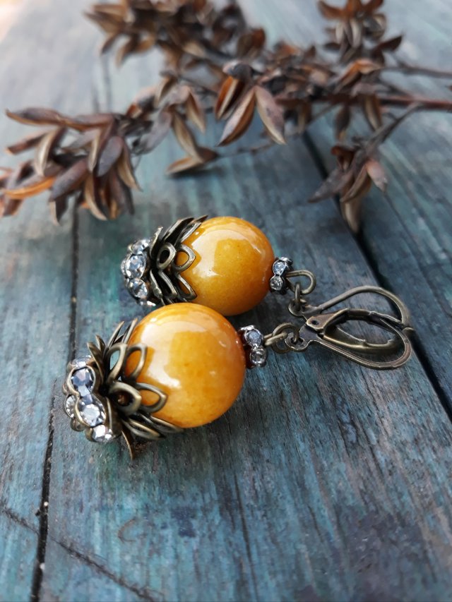 ,,nefrytowe kule,, to kolczyki wykonane z żółtego nefrytu i metalowych elementów w kolorze mosiądzu. Kolczyki zawieszone są na ozdobnych biglach typu angielskiego.