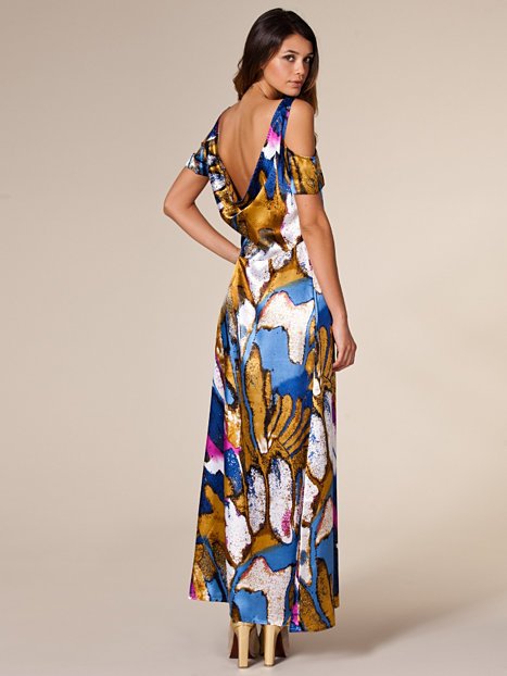 śliczna, barwna, długa sukienka nowa z metką. materiał 100% poliester z atłasowym połyskiem. Wkładana nez zamka. Rozmiar z metki S, ale myślę, że powinna pasować także na małe 38. Podaję wymiary mierzone na płasko;