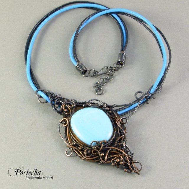 Naszyjnik stworzony od podstaw ręcznie pracochłonną techniką. Miedź połączyłam z pięknym szklanym kaboszonem w odcieniu turkusu. Wisior zawiesiłam na potrójnym nośniku ze skóry i sznura jubilerskiego. Miedź patynowana na antyczny kolor i polerowana w celu wydobycia głębi splotów. Miejscami metal postarzyłam aby nabrał rudawego i czarnego odcienia. Wymiary części ozdobnej 11,4 x 7 cm. Obwód naszyjnika to ok. 60 cm wraz z łańcuszkiem przedłużką.