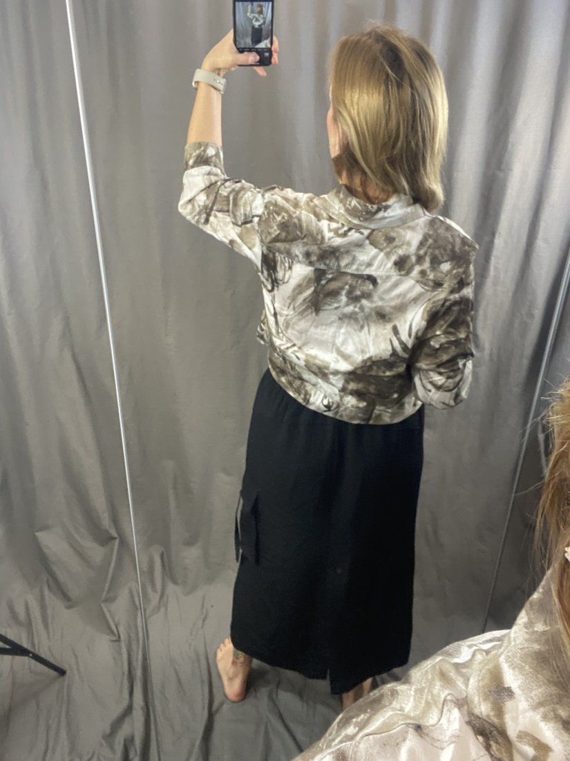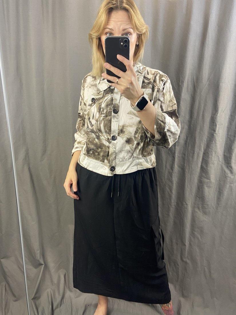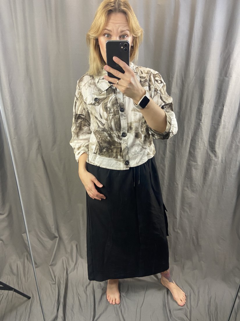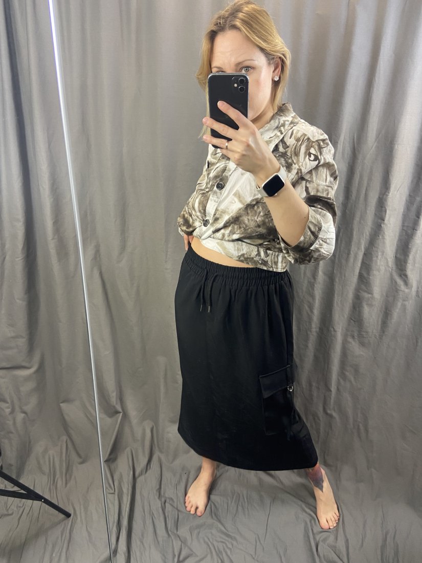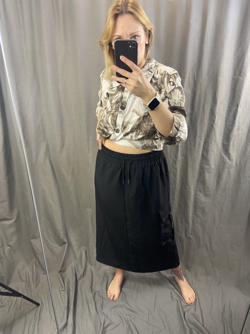 Świetna spódnica od neo noir. Z poliestru z elastyną. Materiał jest super, lejący, nie gniecie się, bosko się układa.