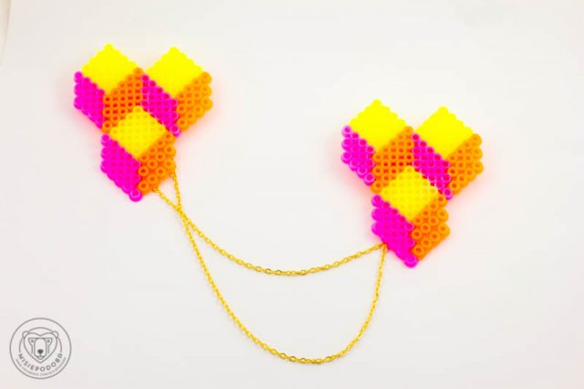 Neonowe przypinki w formie orderów. Ciekawy kształt zamknięty w geometrycznych kostkach oraz jaskrawa kolorystyka ożywią i urozmaicą każdy strój. Przypinki łączą łańcuszki w kolorze złotym o dł. 23 i 30 cm. Ordery o wym. 8 x 6,5 cm wykonane zostały z plastikowych koralików.