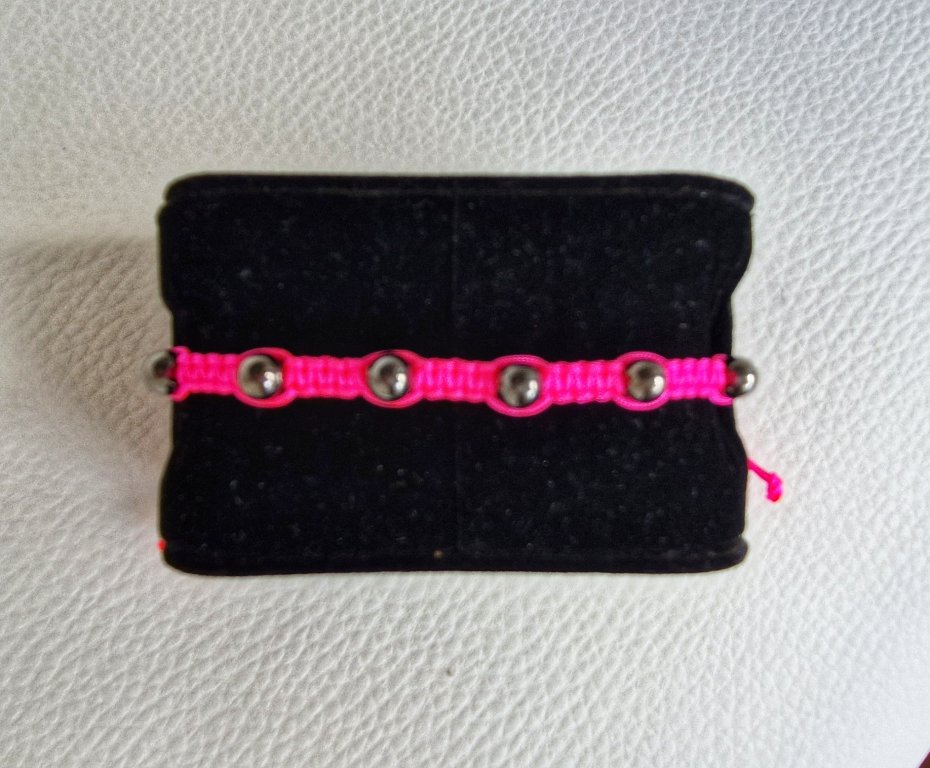Neonowa różowa bransoletka z hematytowymi kuleczkami.