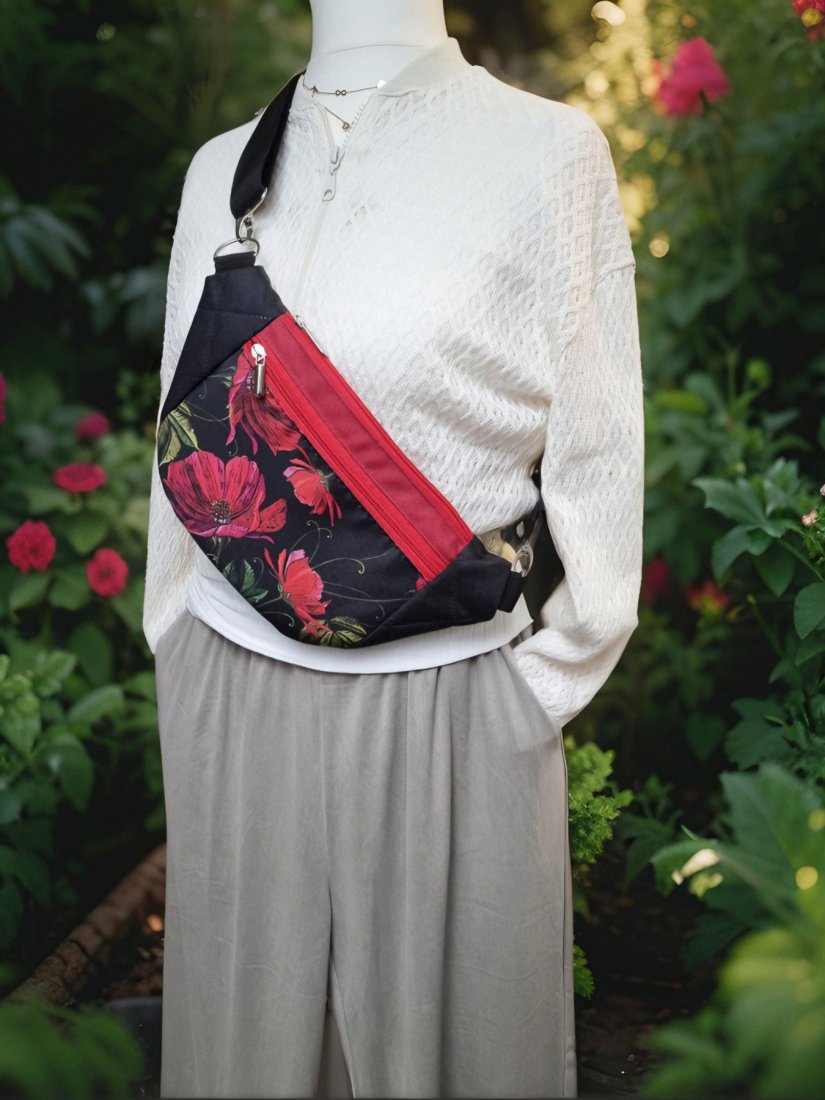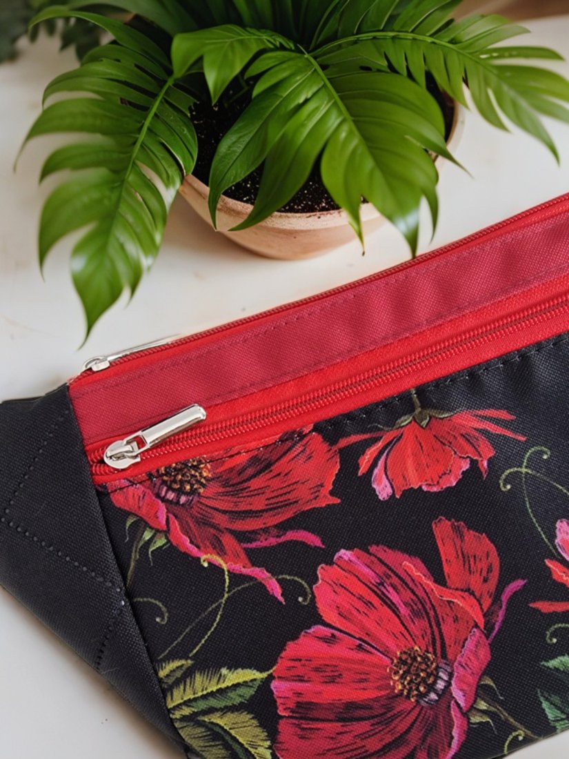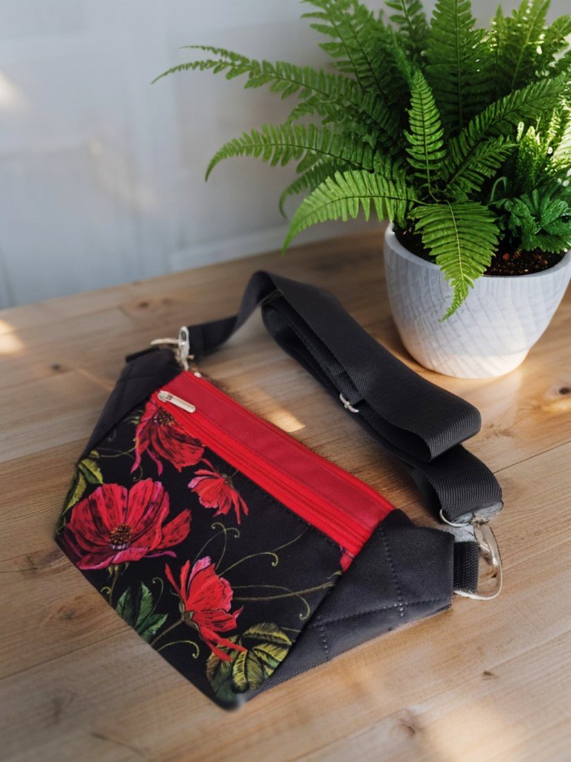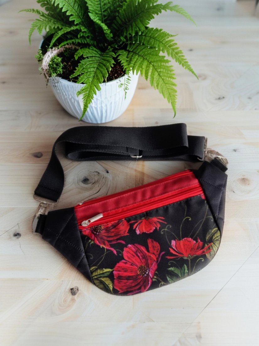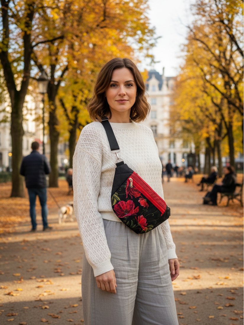 W pracowni narodził się pomysł na coś, co łączy w sobie lekkość i charakter. Tak powstała Emma – nerka, która pomieści wszystko, co potrzebne, a przy tym wygląda jak mały skarb przy Tobie. Czarne tło, na którym rozkwitają czerwone maki, spotyka się z pikowanymi bokami i miękkim, parcianym paskiem – połączenie faktur, które dodaje jej rytmu i życia. Kieszonka z przodu, z tyłu i główna w środku dbają, żeby każdy drobiazg miał swoje miejsce. Emma to nie tylko nerka – to mała opowieść o kobiecości, stylu i wolności ruchu, którą możesz nosić przy sobie każdego dnia.