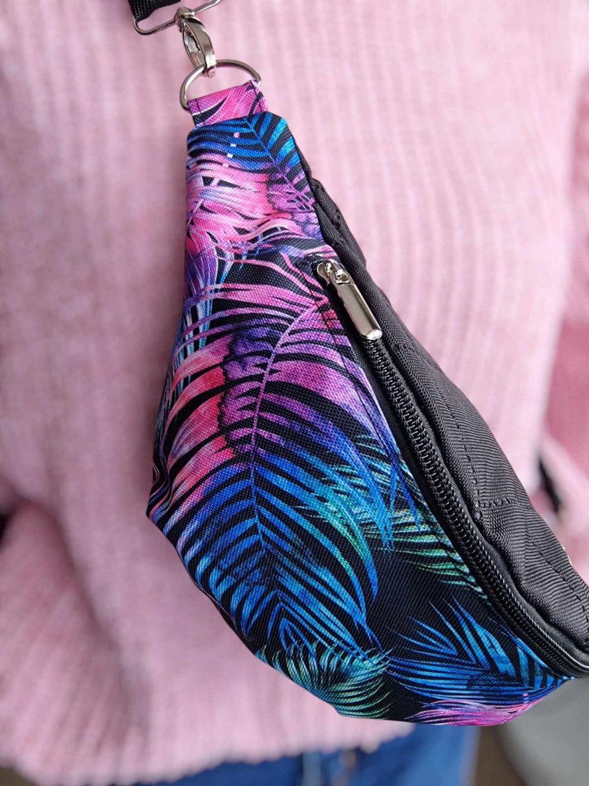 Damska nerka w rozmiarze L, wykonana z wodoodpornej tkaniny tapicerskiej. Tył i góra to czarna pikowana tkanina, przód zdobi motyw kolorowych liści.
