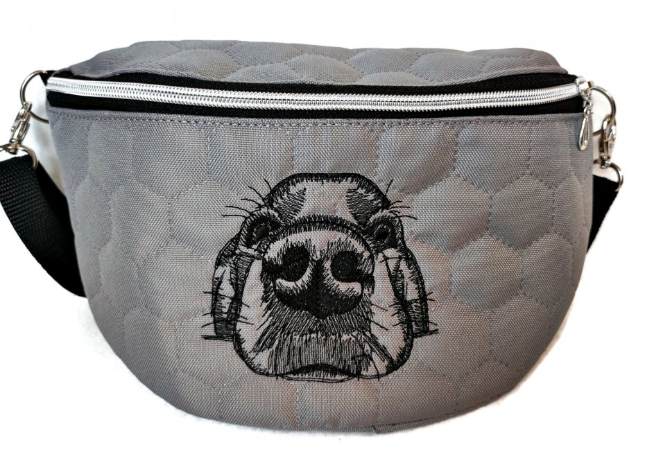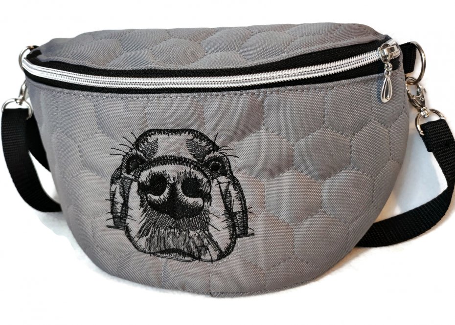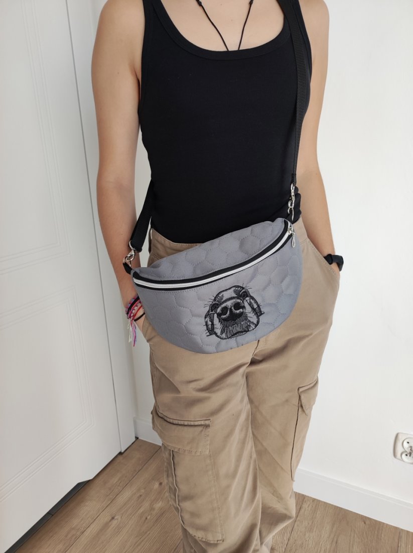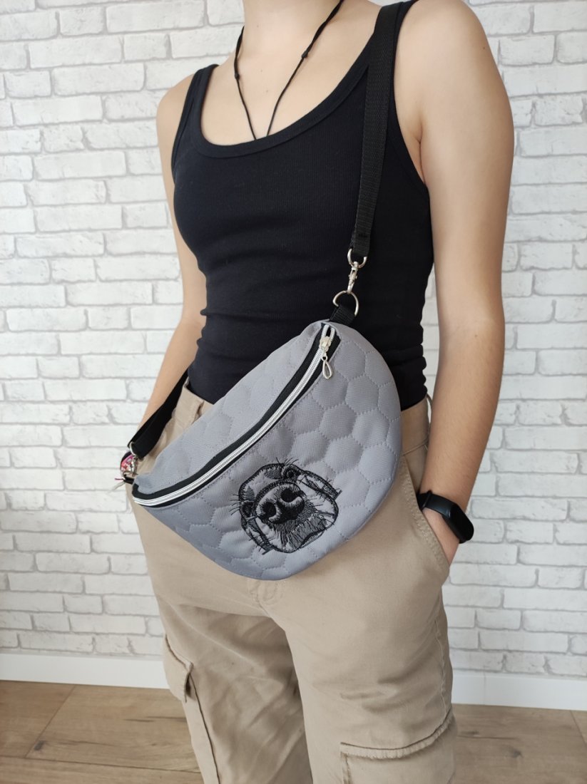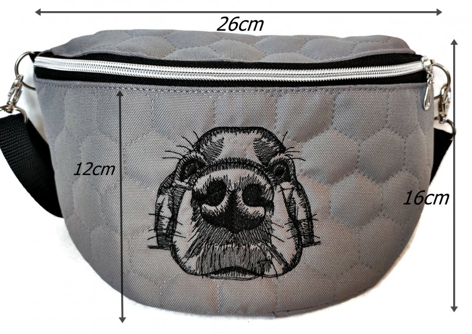 Nerka do noszenia na ramię z regulowanym paskiem, zapinana na suwak, w środku mała kieszonka na suwak.