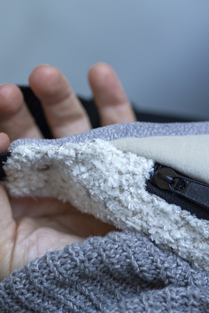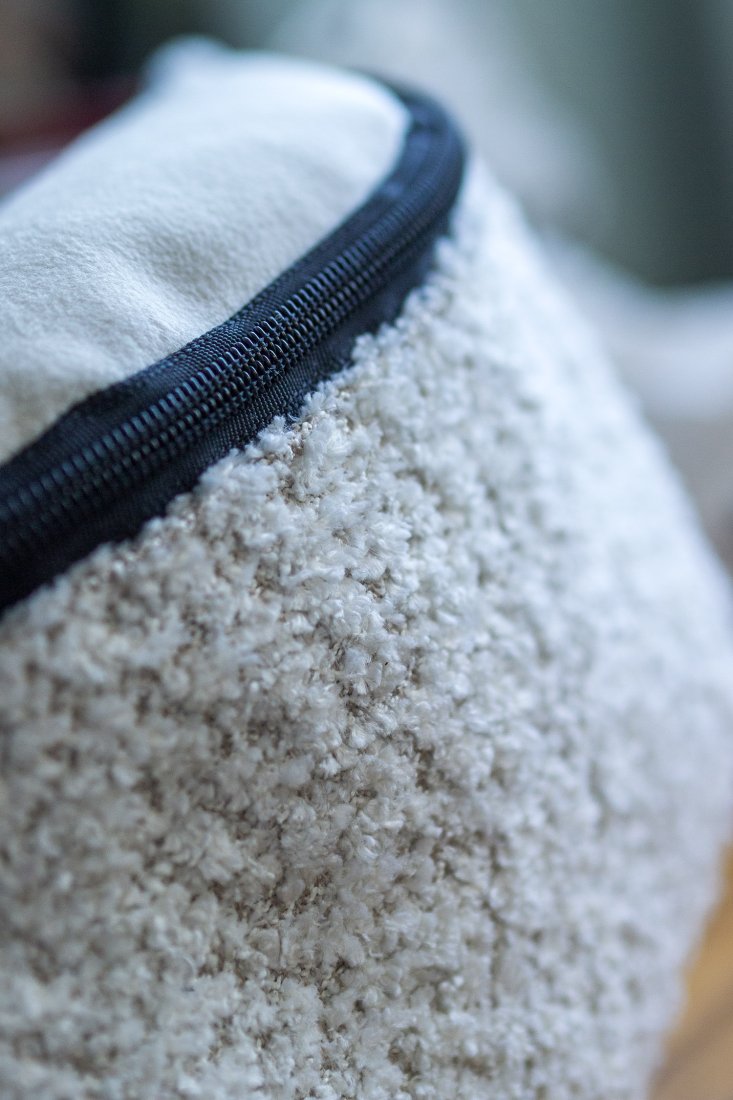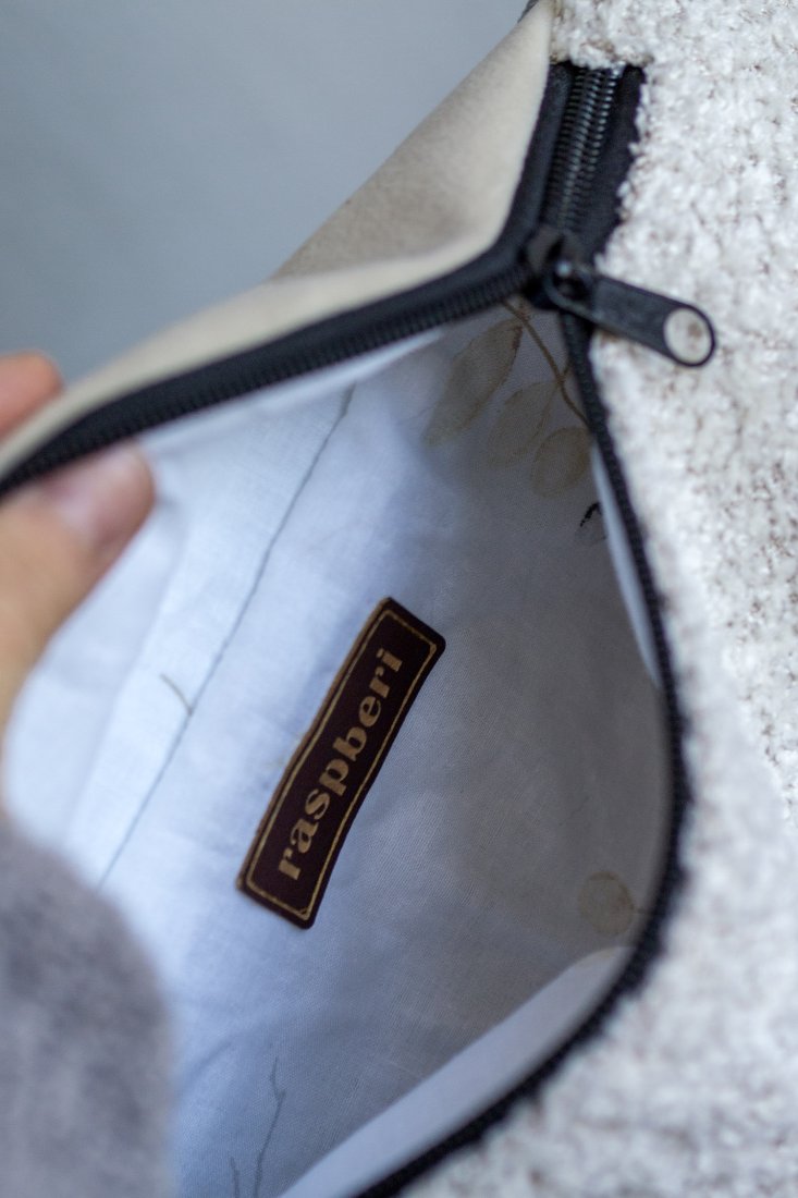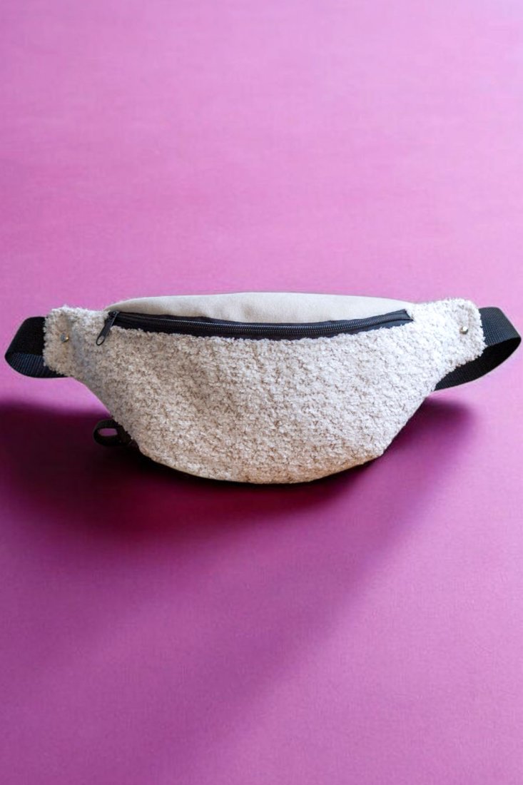 Duża nerka saszetka biodrowa wykonana z miłej w dotyku tkaniny typu "baranek" z jasnobeżową klapą z weluru.
