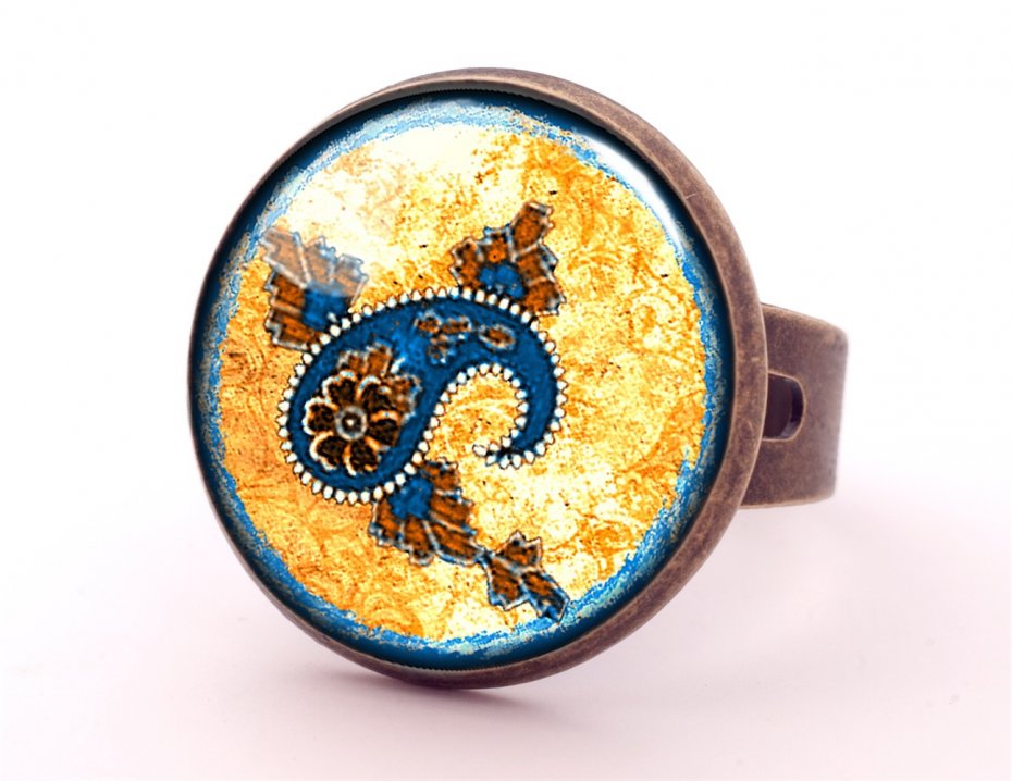 Ręcznie robiony regulowany pierścionek z wysokiej jakości grafiką pokrytą wypukłym, powiększającym szkiełkiem.