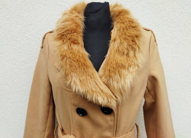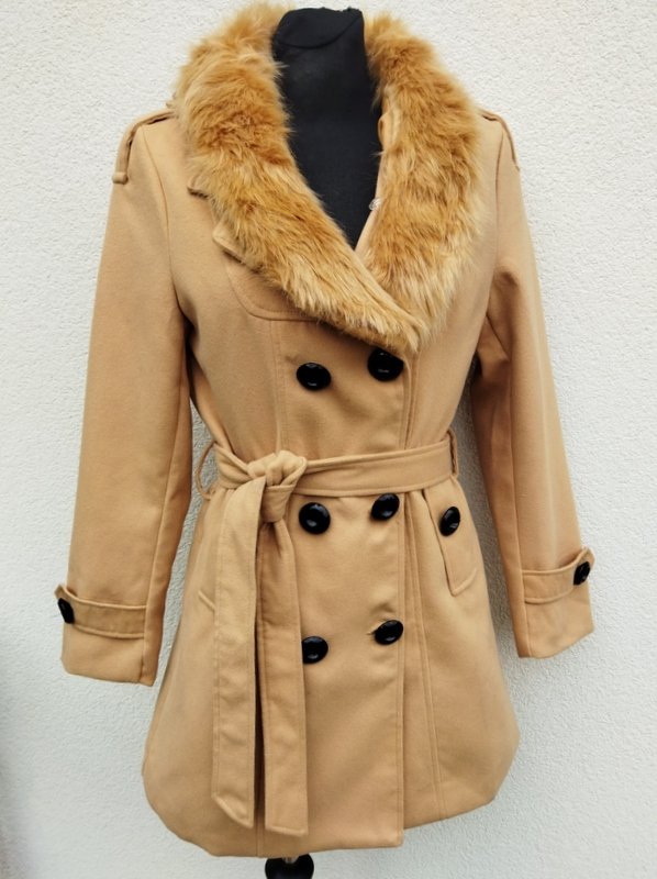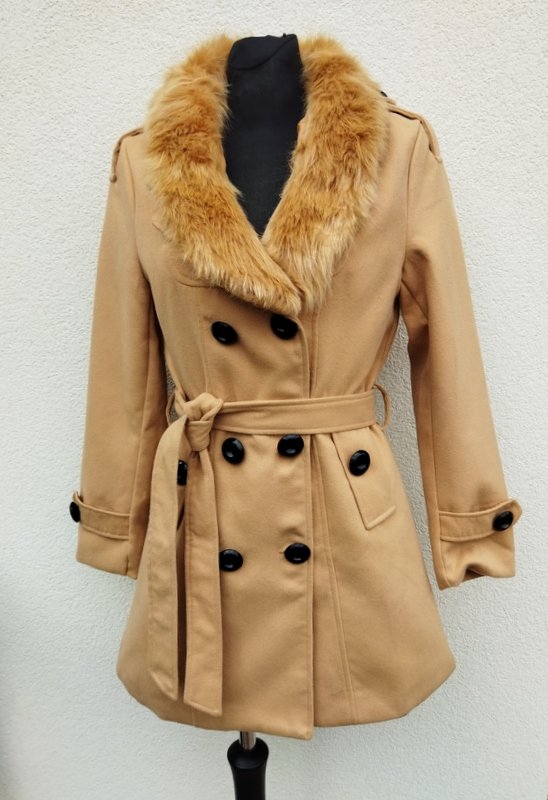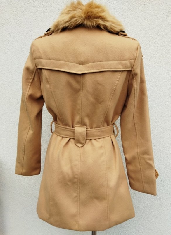 Płaszcz z flauszowej tkaniny w beżowym ( kamelowym) kolorze. Z kołnierzem z rewersami z dopinanym kołnierzem ze sztucznego futerka, z dwiema wpuszczanymi kieszeniami, z patkami na mankietach rękawów i pagonami na ramionach . Wiązany paskiem w talii. Dwurzędowy , zapinany na guziki. Całość na podszewce.
