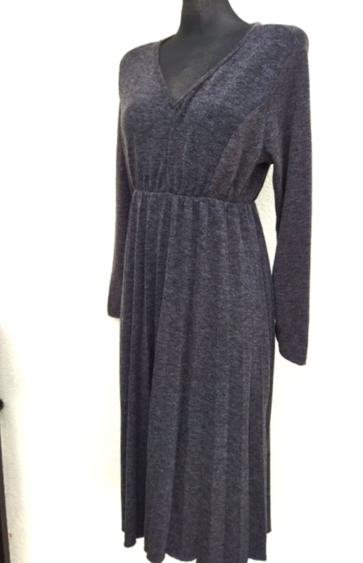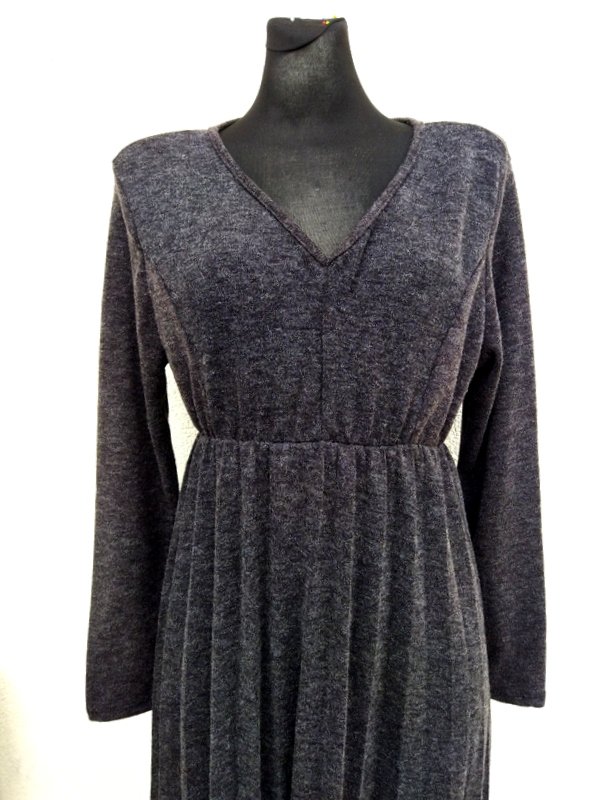 Miła dzianinowa wiskozowo-wełniana sukienka w melanżowym ciemnoszarym ( grafitowym) kolorze. odcinana pod biustem , dekolt w szpic, w  linii odcięcia wszyta gumka,  dół plisowany rozkloszowany .  Bez podszewki. Miła,  wygodna ,  dobrej jakości