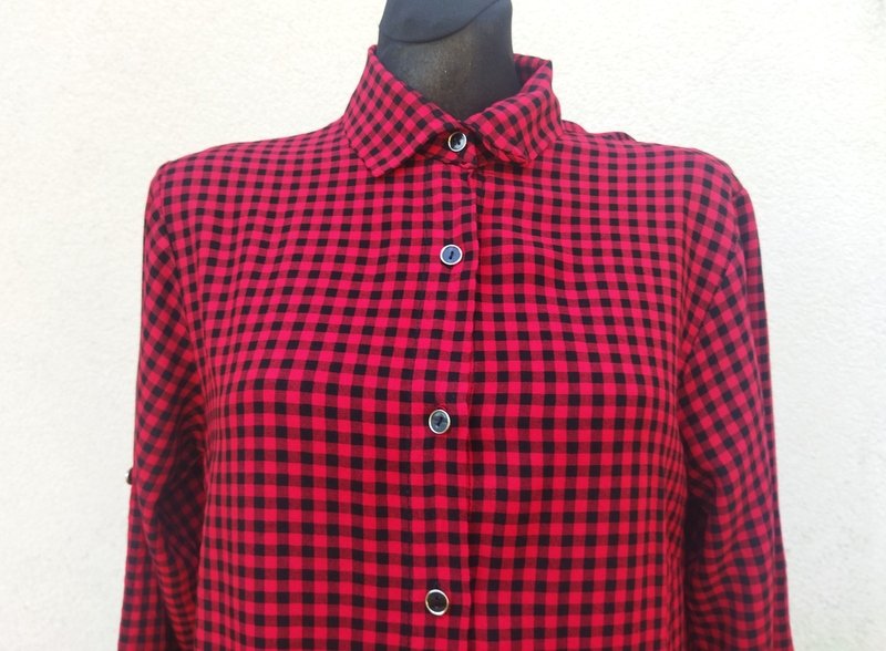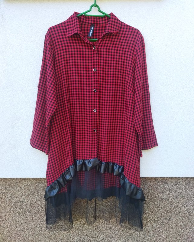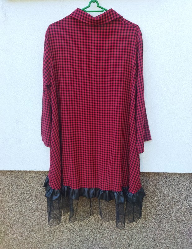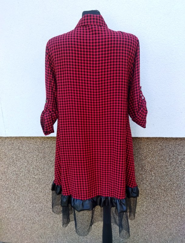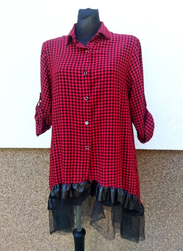 Świetna koszulowa sukienka z mięciutkiej bawełnianej tkaniny w czerwono-czarna krateczkę z doszywanymi dołem czarnymi falbankami krótsza z poliestru dłuższa z tiulu. Luźny swobodny trapezowy fason, z kołnierzykiem, z dwiema wpuszczanymi kieszeniami w szwach bocznych, rękawy z możliwością podpinania. Zapinana na całej długości na małe ozdobne guziczki. Asymetryczna - dłuższa z tyłu