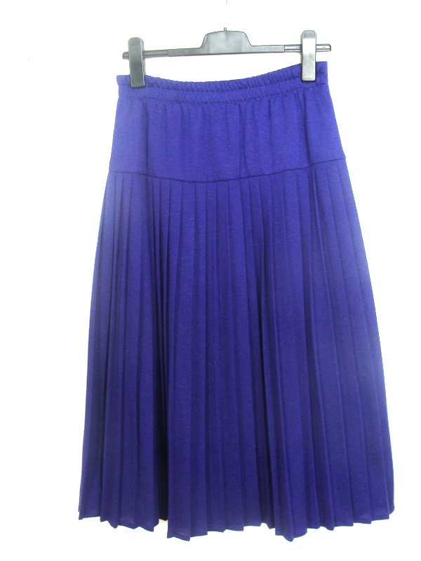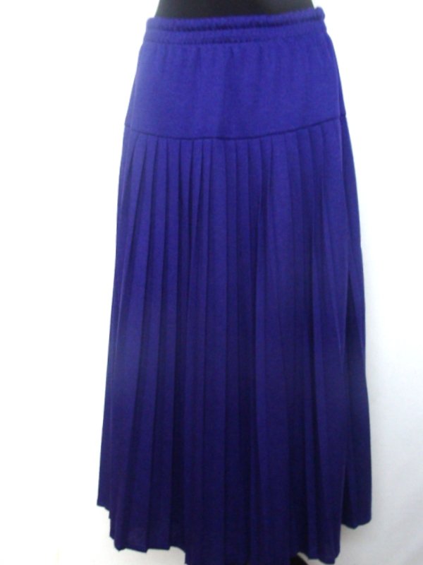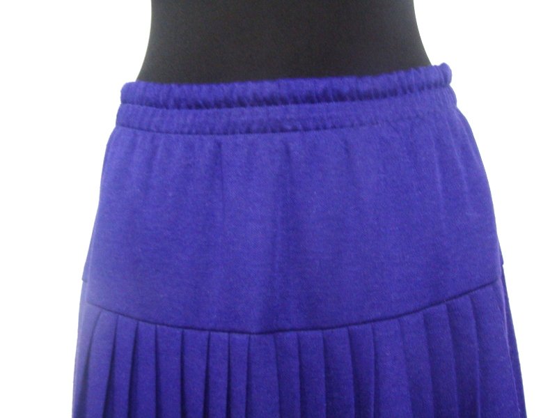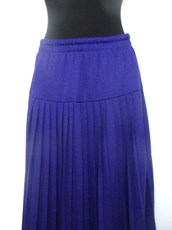 Plisowana spódnica z dzianinowej tkaniny w śliwkowym kolorze, na 13 cm karczku. Na mocnej gumie w pasie. Wciągana - bez zamka. Na podszewce.