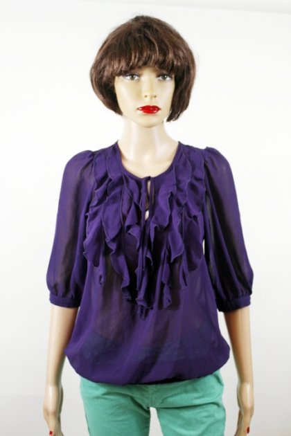 Piękna tiulowa bluzka marki New Look w rozmiarze 36 ( choć na metce widniej rozmiar 34, wymiary są zgodne z rozmiarem 36). Kolor fioletowy. Z przodu efektowny żabot. Z przodu zawiązywana na kokardę. Rękawy zapinane na guzik. Na dole marszczony ściągacz. Materiał 100% poliester. Przy metce ze składem materiału zapasowy guzik. Stan bardzo dobry