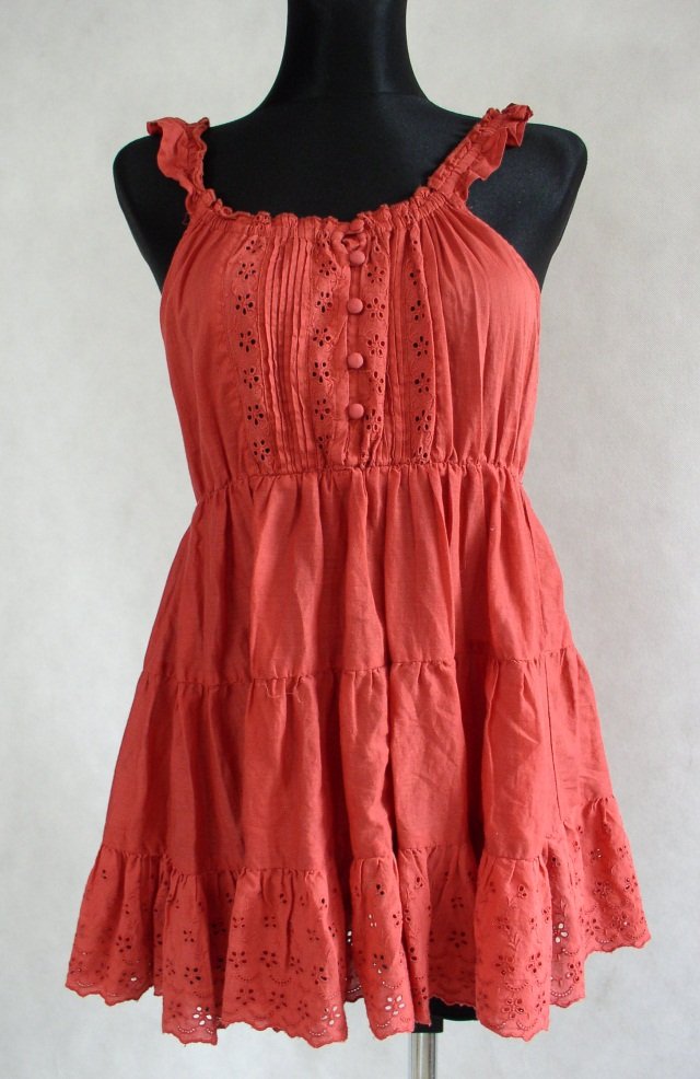 Bluzka firmy new look.Rozmiar 14,nasz 40-42..Materiał bawełna,ozdobiona haftem angielskim.Odcięta w pasie+gumka.Góra razem z ramiączkami ściągana gumą.Z przodu rozcięcie zapinane na guziki z pętelką.Dół z trzech falban.Stan bardzo dobry-.Długość 76 cm.pod pachami 102 cm.Kolor ceglasty.