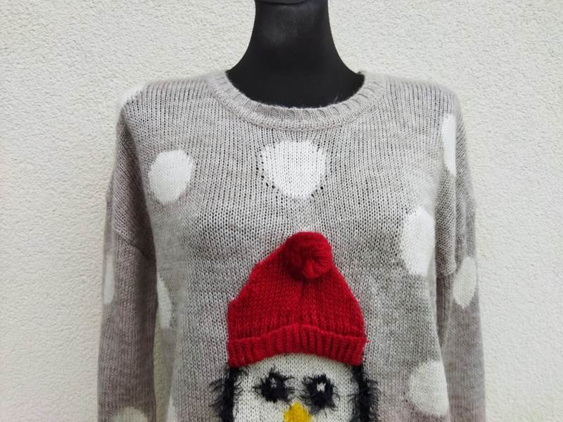 Miły, mięciutki sweterek z akrylowej włóczki w jasnoszarym kolorze z zimowym świątecznym akcentem ożywiony czerwienią, bielą i czernią. Wykończony ściągaczami